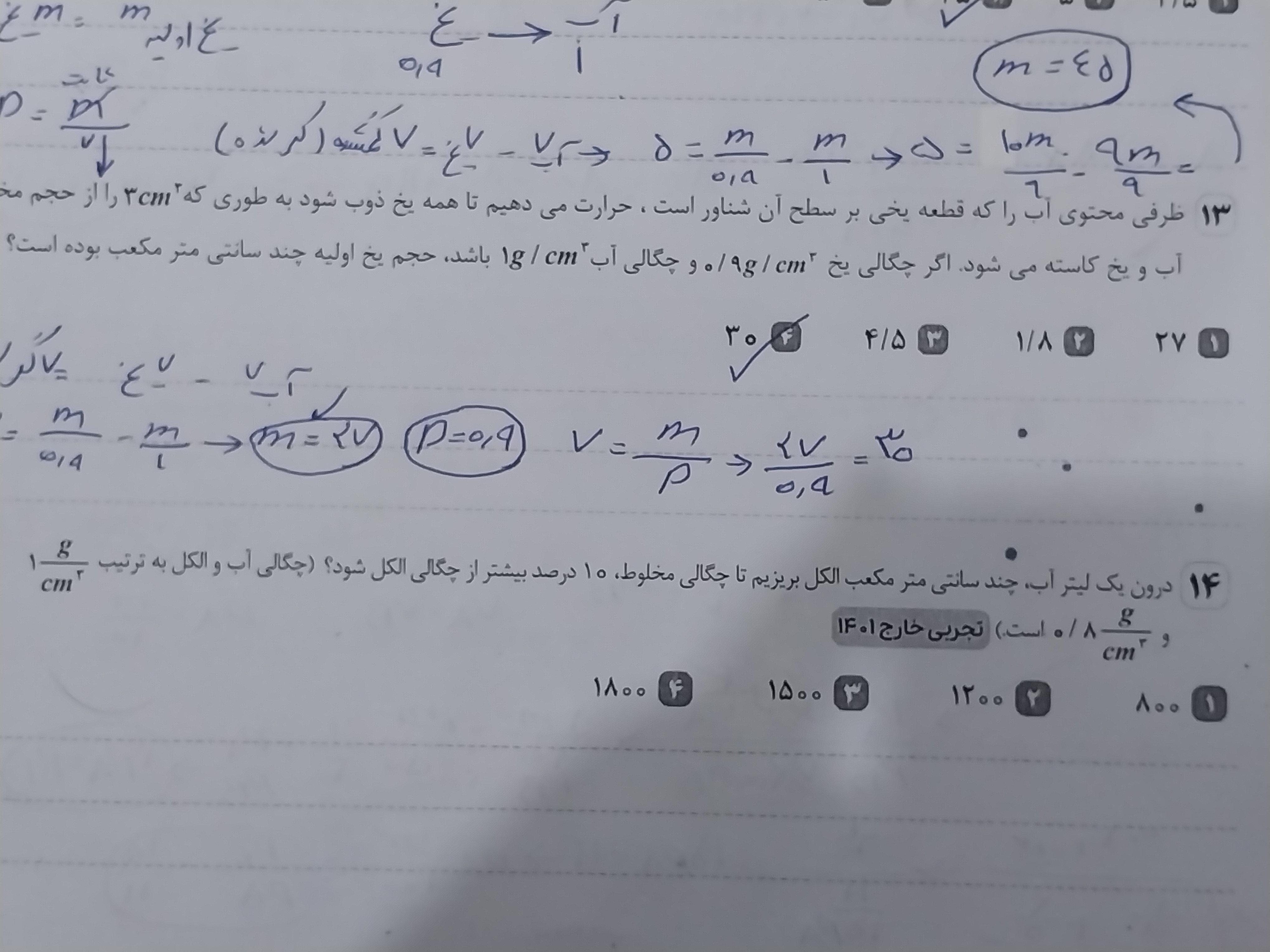 سلام سوال 14 میش چگال اب مساوی است 1.1 چگالی الکل که 1.1 چگالی الکل برابر 0/88 است پس با جایگذاری گزینه ها به جواب 1500 می رسیم
