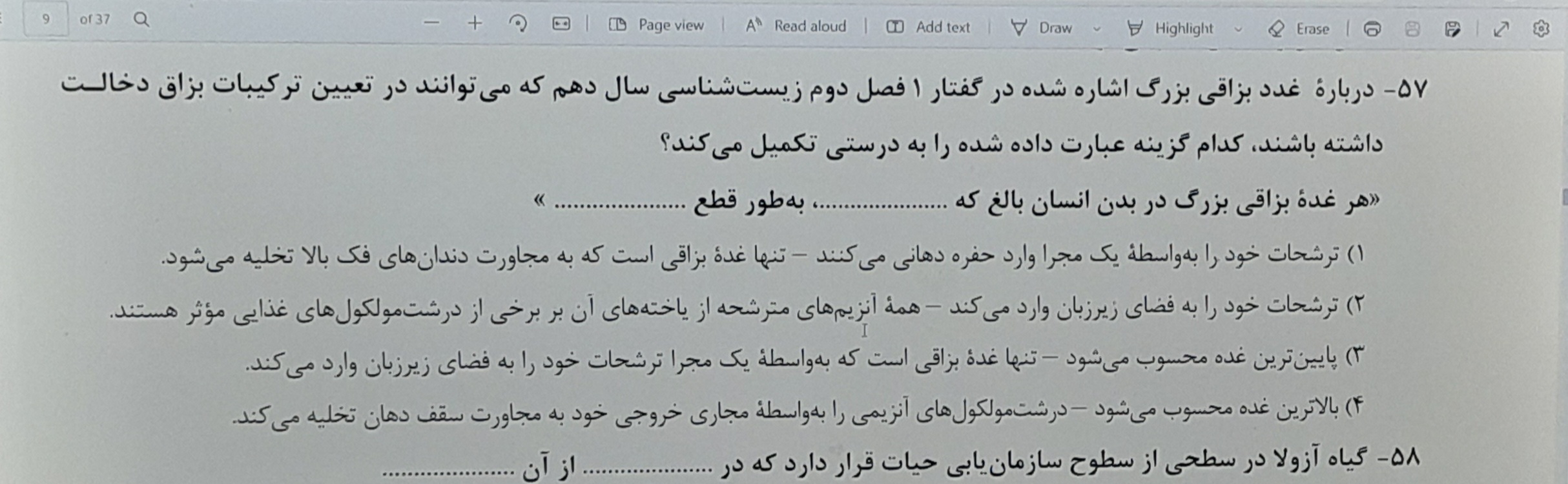 بنظر منم گزینه 3 ایراد دستوری داره، انگار میگه غدد بزاقی بزرگی که میتونن با ترشحات خودشون ذره ها رو به توده لغزنده تبدیل کنن، فقط اونایی هستن که در فک پایین قرار دارن