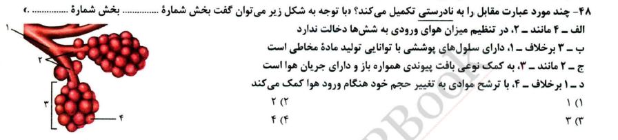 سلام وقت بخیر:) من درمورد ادبیات این تست یه سوال دارم.. یه تست از کتاب خیلی سبز با ادبیات مشابهِ این سوال دیدم که ربطی به اینجا نداره و مربوط به بحث تنفس هست، ولی ممنون میشم کمکم کنید... 💛💛 استاد یه مثال زدن که مفهوم جملات رو بهتر درک کنیم، گفتن انسان همانند پرنده بال ندارد.. اگر بخوایم با این زاویه دید گزینه 1 رو نگاه کنیم، باید بگیم حبابک مانند نایژک مبادلهای در تنظیم میزان هوای ورودی به شش ها دخالت ندارد.. که طبق مدل تحلیل استاد، این جمله درسته! ولی در پاسخنامه گزینه 1 رو بخاطر کلمهی "همانند" غلط گرفته.. کدوم زاویه دید صحیحه؟!