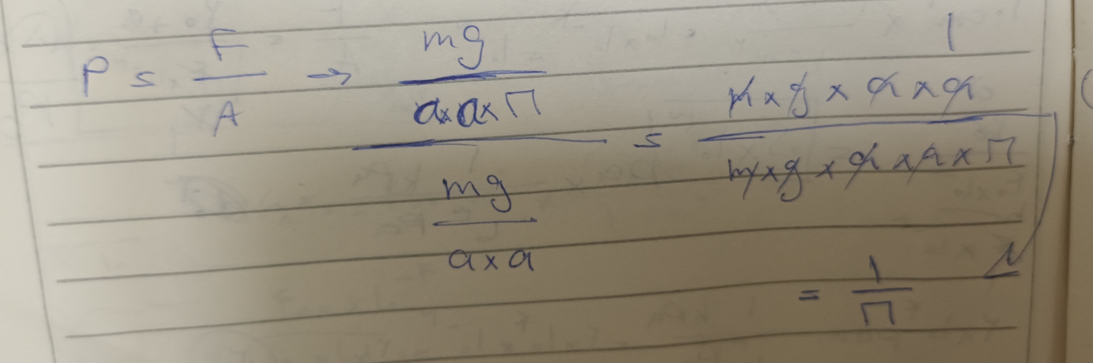 سلام دوست عزیز ببین طبق داده سوال حجم ها و جنس هاشون(چگالی) باهم برابره بنابراین نتیجه می گیریم جرم هر دو جسم هم با هم برابره حالا نسبت فشار استوانه به مکعب رو می خواد می نویسیم p2 به p1 بعد مساوی قرار میدیم با A1 به A2(چرا فشار با مساحت رابطه عکس داره؟ چون هرچی مساحت زیاد بشه فشار کمتر میشه و بالعکس) حالا دیگه همون جای گذاری استاد رو انجام میدیم و جواب به دست می اید. برای بهتر متوجه شدن رابطه فشار با مساحت میشه به بند کوله پشتی ها اشاره کرد: اگر بند کیف شما پهن باشه فشار کمتری به شانه شما وارد میشه و اگر بند کیف شما باریک باشه فشار بیشتری به شانه وارد میشه امیدوارم توضیحاتم براتون مفید باشه