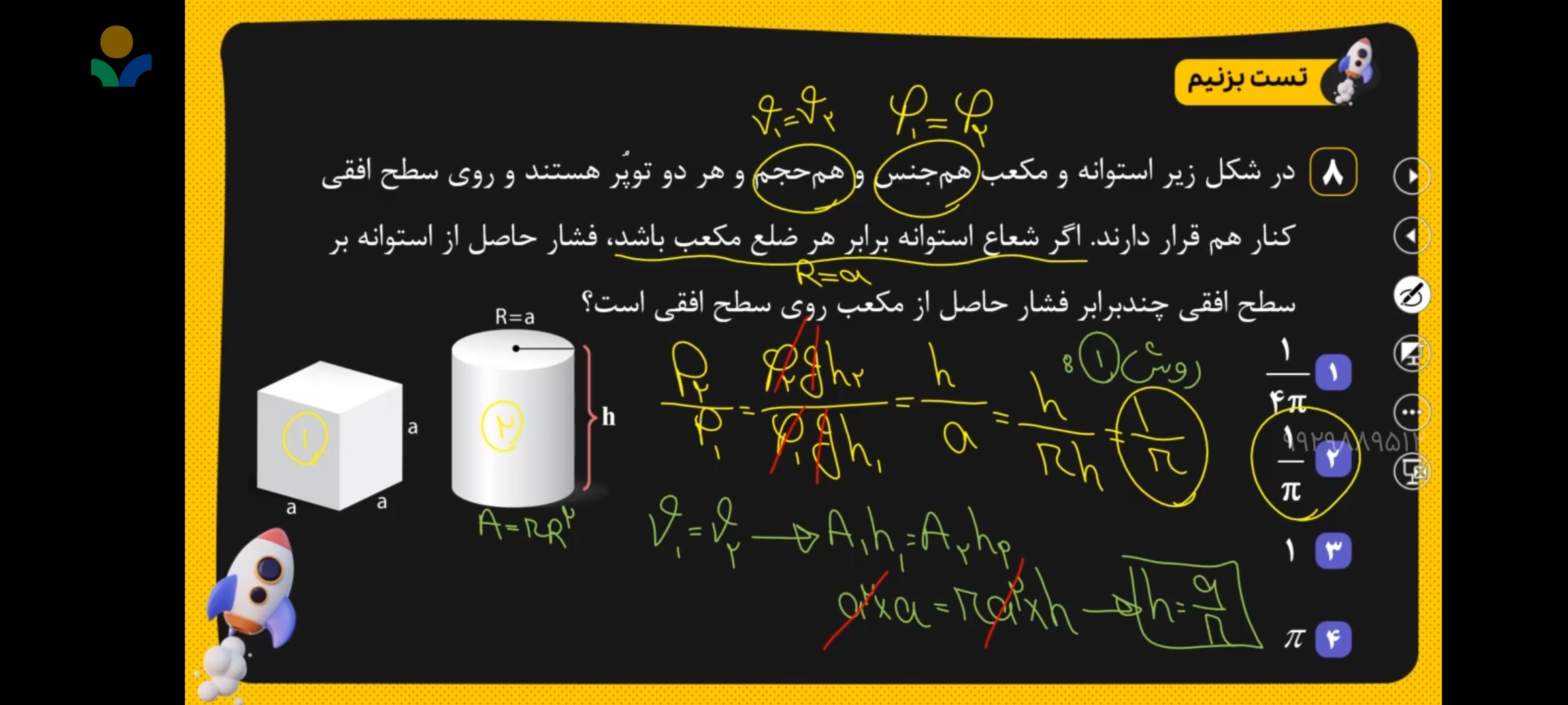 سلام . سوال گفته استوانه و مکعب همجنس یعنی چگالی هاشون باهم برابره و هم حجم هستند حالا با توجه به اطلاعاتی که بهت داده مثلا گفته طول ضلع هاشون و ... متغیر میزاریم و مینویسیم بعد این مسائل نسبتی ان پس فشاری که استوانه وارد میکنه رو بر روی فشاری که مکعب وارد میکنه مینویسی میدونیم که فشار از رابطه ی pghبدست میاد پس جای گذاری کن چگالی ها که خط میخورد چون برابرن شتاب جاذبه هم خط میخوره و فقط ارتفاع ها میمونه ازطرفی به تو گفتv=vو v=A.hمن اینطوری گفتم که حجم استوانه و حجم مکعب رو بدست اوردم و مساوی گذاشتم و بعد a برحسب h بدست میاد حالا هم جایگذاری میکنه و جوابت بدست میاد امیدوارم خوب بوده باشه 🌹