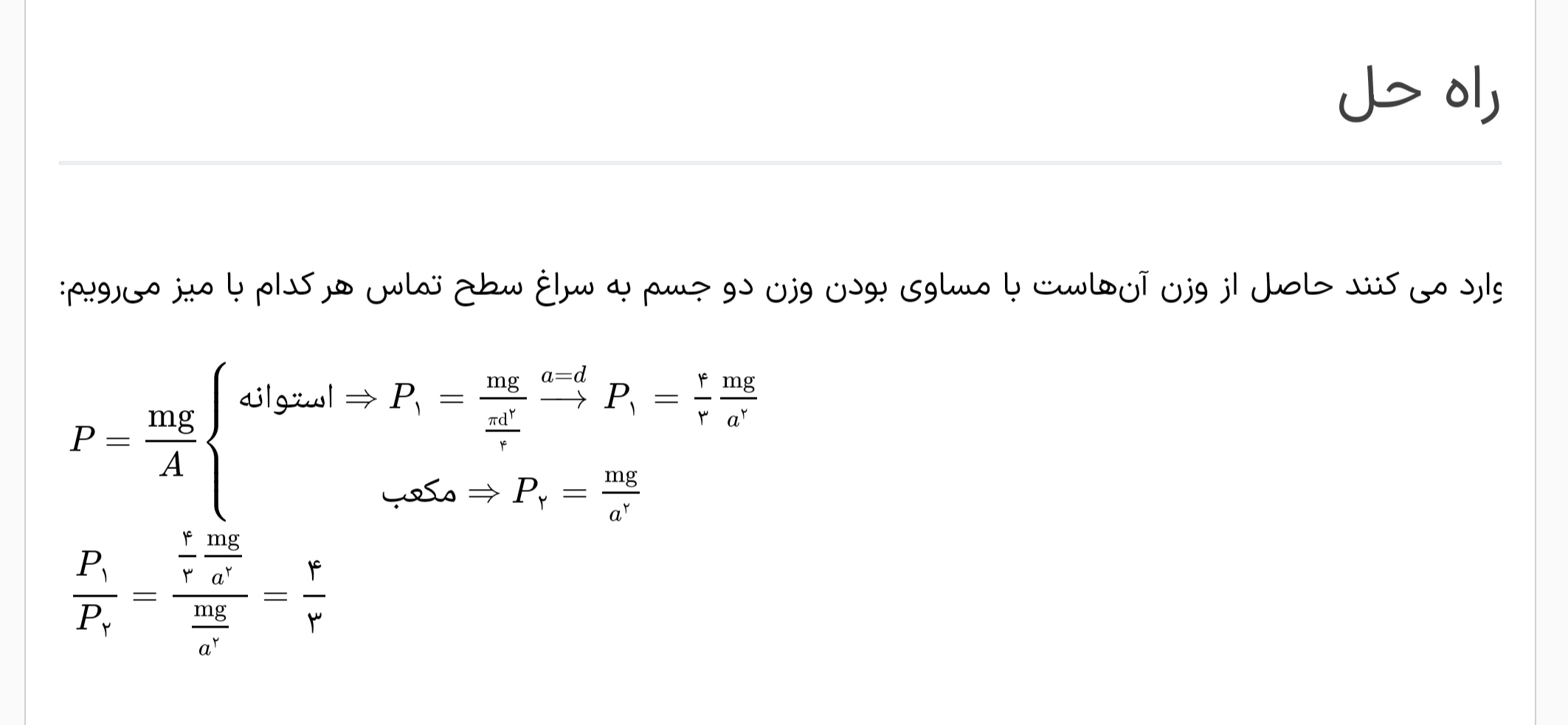سلام چیزی که شما نوشتی درسته شما اومدی محاسبه کردی که اگه این مخروط رو از سطح بزرگ‌ترش بذاری روی زمین،نسبت به حالت اول،نسبت فشاری که وارد می‌کنه چجوریه اما خواسته سوال اینه که وقتی از سطح بزرگ می‌ذاریم روی زمین،چه وزنه ای باید بذاریم روش که با فشار حالت اول یکسان بشه