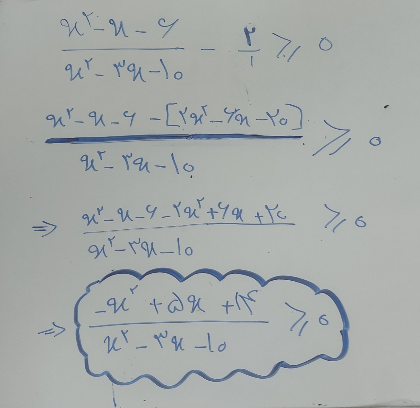 به طور کلی هر نامعادله ای که به ما داده شد باید از تعیین علامت استفاده کنیم اما این تعیین علامت یک شرط مهم داره که یک طرف نامعادله صفر باشد برای همین ۲ را از آن طرف تساوی میاریم این طرفش و به صورت زیر مخرج مشترک میگیریم. و سپس تعیین علامت میکنیم.