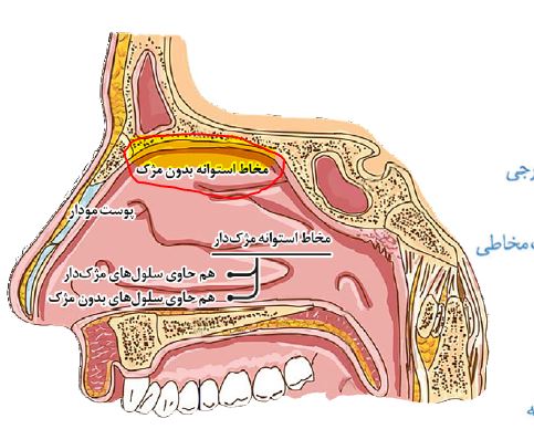 @.... ..... اون منطقه ای که نوشته شده مخاط استوانه ای بدون مژک ، منطقه بویایی هم هست . گزینه 3 درسته چون در انتهای مجرای بینی یاخته های گیرنده بویایی مژک دار وجود داره.