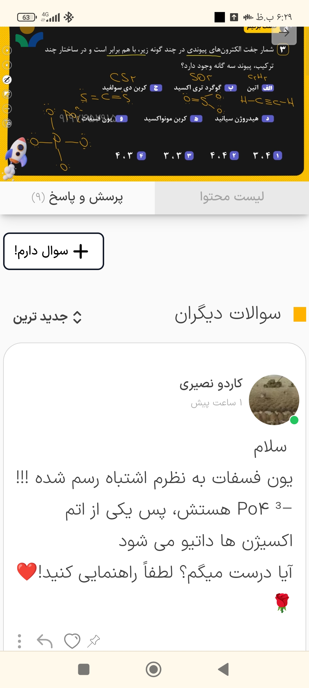 سلام، وقت به خیر قبلا یکی از دوستان پرسیده بودند، ظاهرا در دقیقه 1:20 از حل تست در مورد یون فسفات اشتباه کوچکی رخ داده، یون فسفات 3 بار منفی داره و در نتیجه قراره 3 تا الکترون به 3 تا از اکسیژن ها داده بشه و فقط یک پیوند داتیو لازم میشه، در صورتی که در فیلم صحبت از 2 الکترون و 2 پیوند داتیو شد.