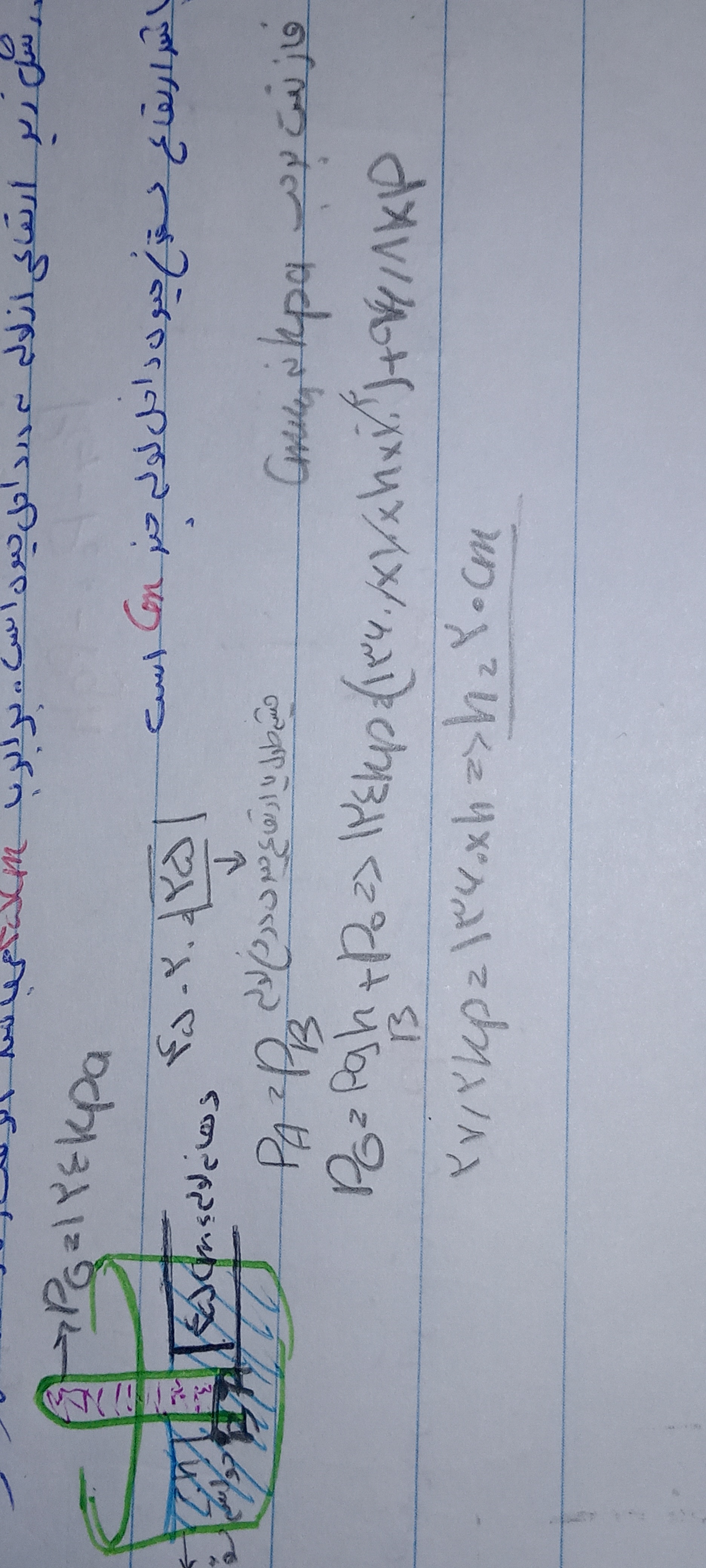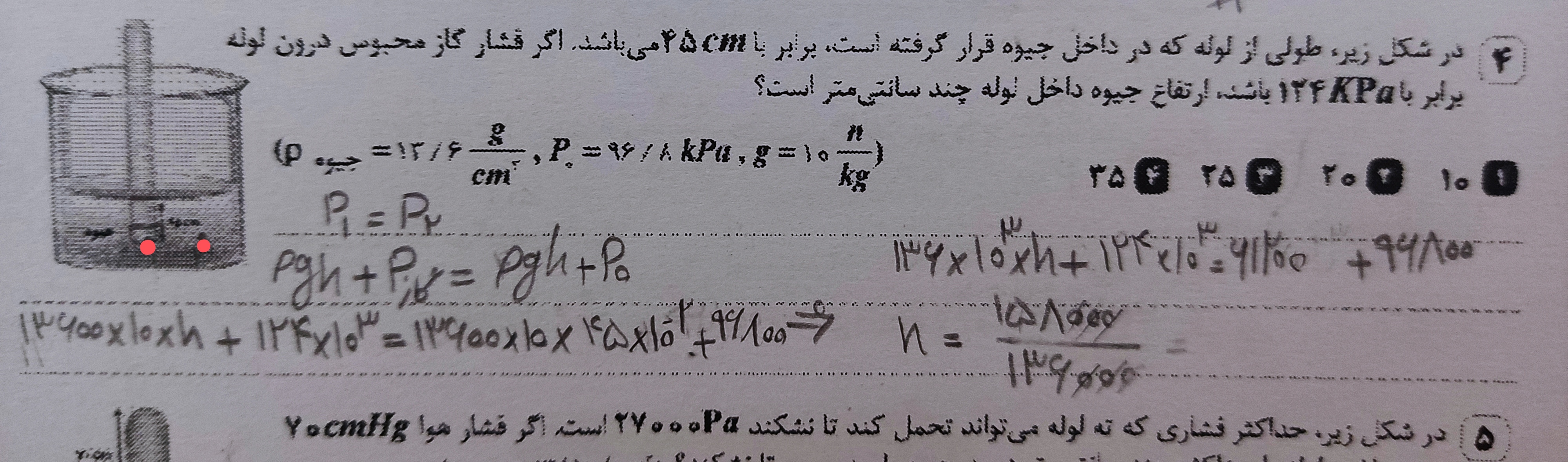 سلام من اول فشار اون قسمت رو بر حسب پاسکال 27200 بدست اوردم بعد تقسیم بر 1360 کردم جواب شد 20 سانتی متر جیوه که میشه همون 20 سانتی متر . در اخر هم که از 45 کم کردم