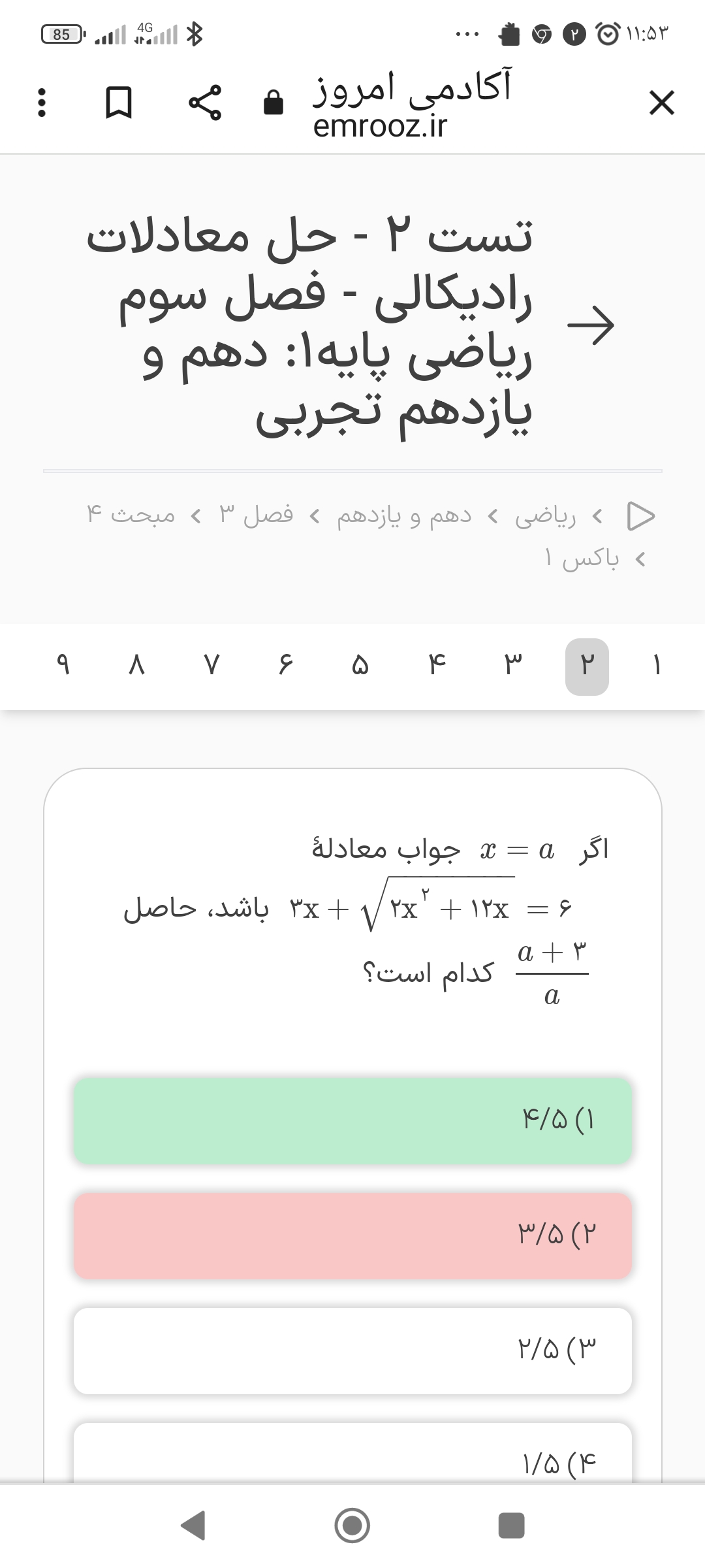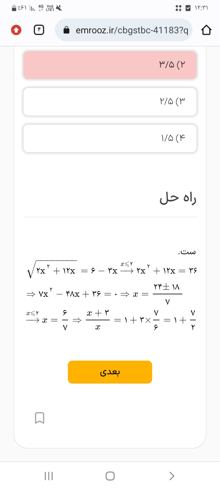 تمرین یادبگیریم1 ریاضی دهم و یازدهم فصل 3 مبحث 4 باکس 1 1 2 3 4 5 6 7 8 9 اگر x=a جواب معادلهٔ ۳x+۲x۲+١۲x−−−−−−−−√=۶ باشد، حاصل a+۳a کدام است؟ 1) ۵‏/۴‏ 2) ۵‏/۳‏ 3) ۵‏/۲‏ 4) ۵‏/۱‏ راه حل گزینه ۱‏ پاسخ صحیح است. ۲x۲+١۲x−−−−−−−−√=۶−۳x−→x⩽۲۲x۲+١۲x=۳۶−۳۶x+۹x۲ ⇒۷x۲−۴۸x+۳۶=۰⇒x=۲۴±١۸۷ −→x⩽۲x=۶۷⇒x+۳x=١+۳×۷۶=١+۷۲=۴/۵ بعدی