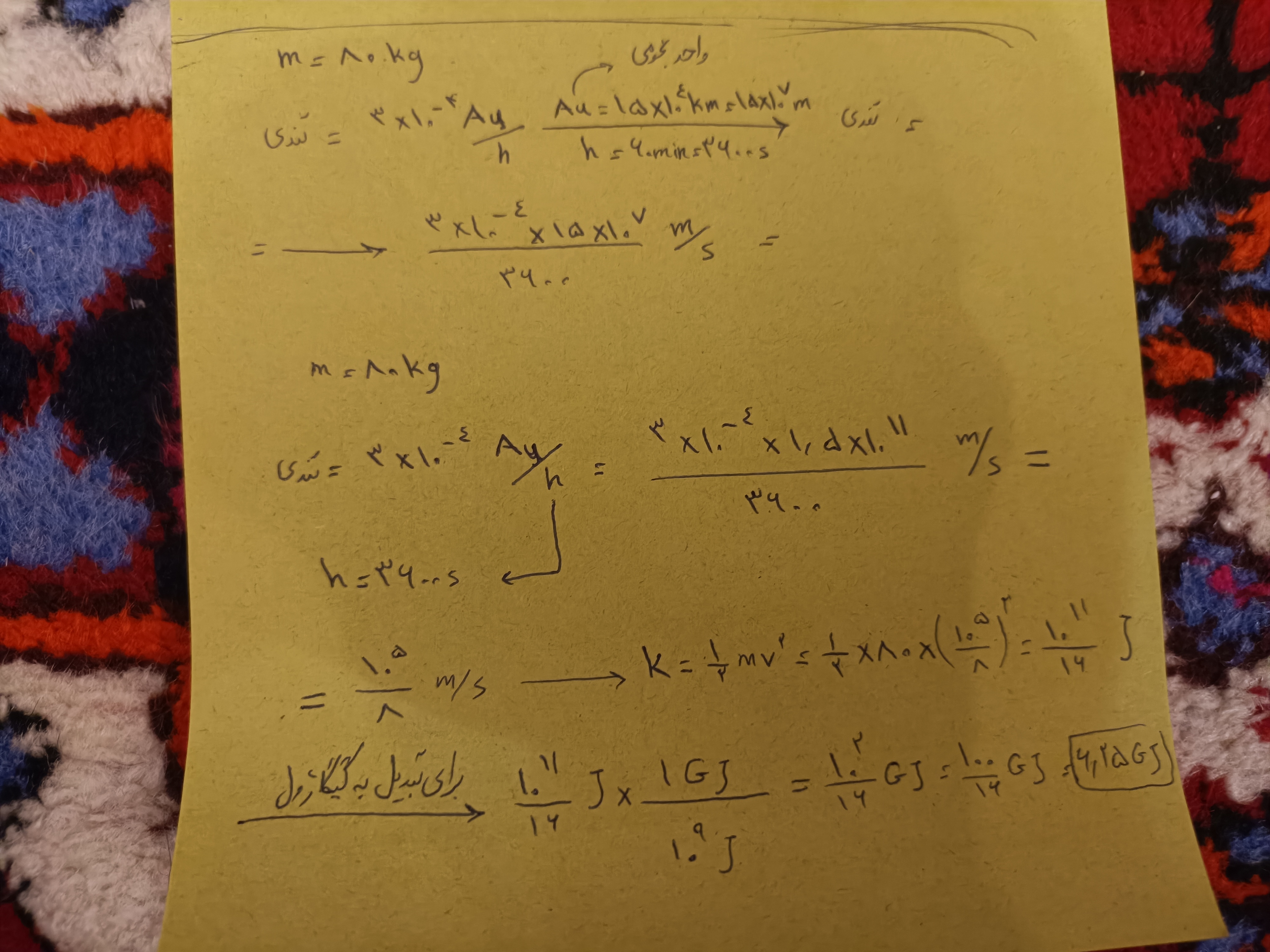 سلام طبق فرمول انرژی جنبشی، با داشتن جرم و سرعت که توی فرمول قرار میگیره و انرژی جنبشی بدست میاد که واحدش ژول هست بعد باید تبدیل واحد انجام بدی و ژول رو به گیگا ژول تبدیل کنی