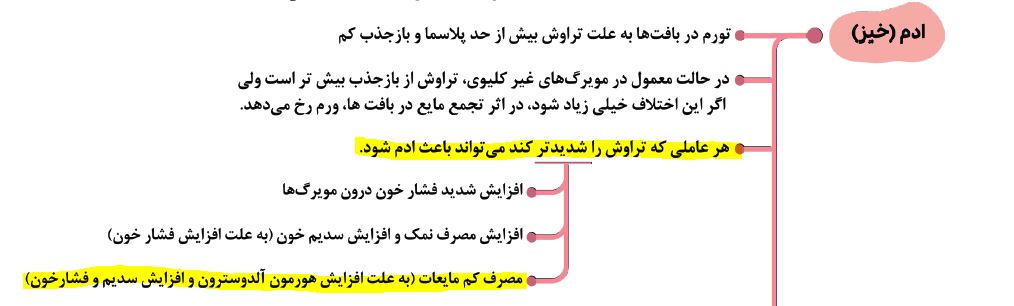 سلام توی یادبگیریم 5 صفحه 135 داشتیم که هر عاملی که تراوش رو شدیدتر کنه میتونه باعث ادم بشه. یکی از عواملی که باعث میشد تراوش شدیدتر بشه مصرف کم مایعات بود.