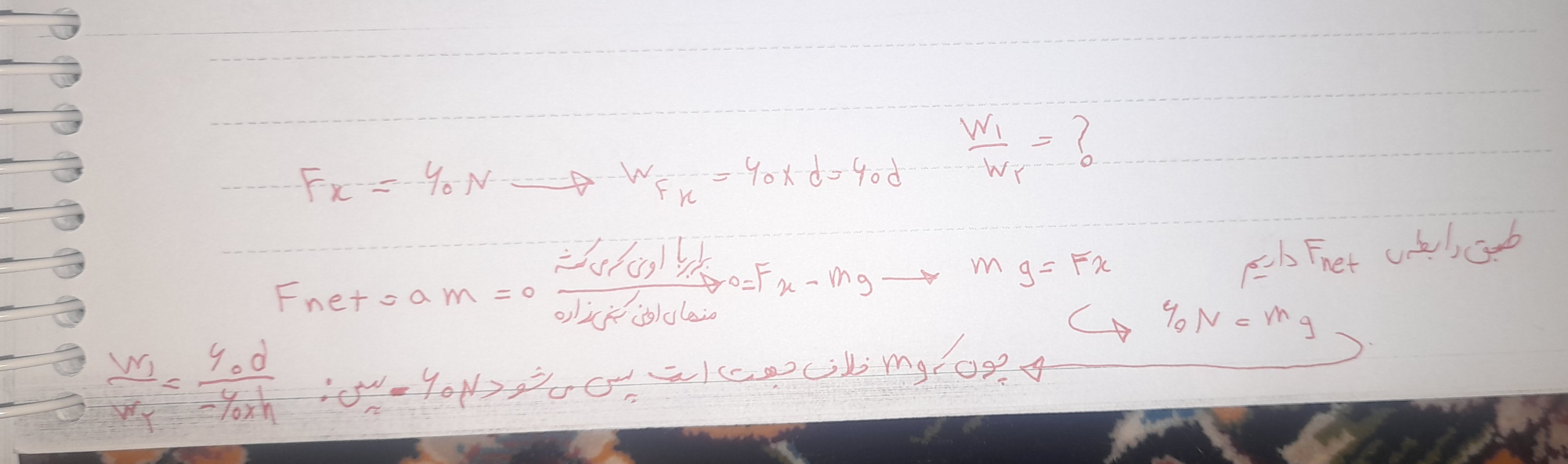 اینجا اگه طبق فرمول f net بریم جلو؛ازونجایی که a صفره کار وزن و قرینه کار نیرویf برابر میشن پس نمیشه بگیم منفی یک درسته)گزینه اول(