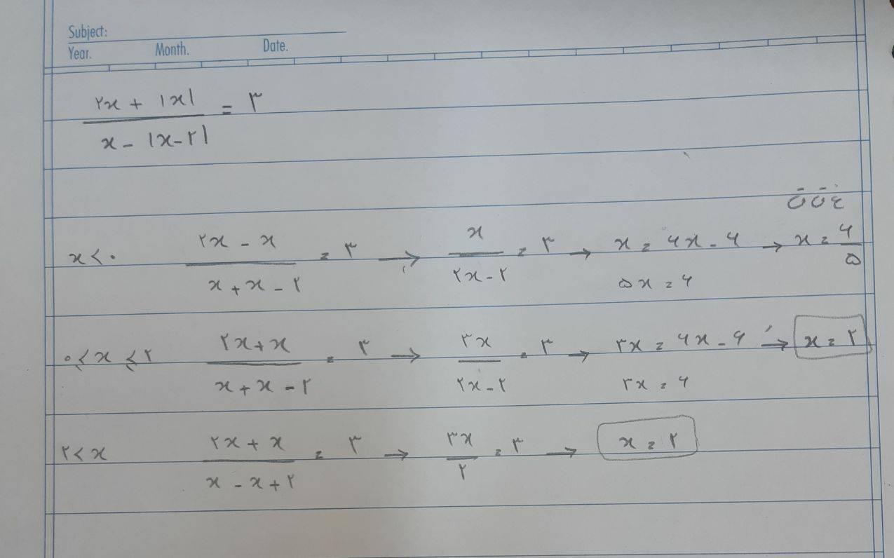 سلام بعد از اینکه قدر مطلق ها رو اوردی یک طرف معادله ، باید ریشه های قدر مطلق رو بدست بیاری که میشه 0 و 2 ، بعدش یه عدد بعد 2 میزاری و یه عدد قبل 0 . که میشه 1- و 3 حالا عدد های 1- 0 2 و 3 رو در معادله ی قدر مطلقی جایگذاری میکنی و بعدشم که نقاط رو رو نمودار جای گذاری میکنی