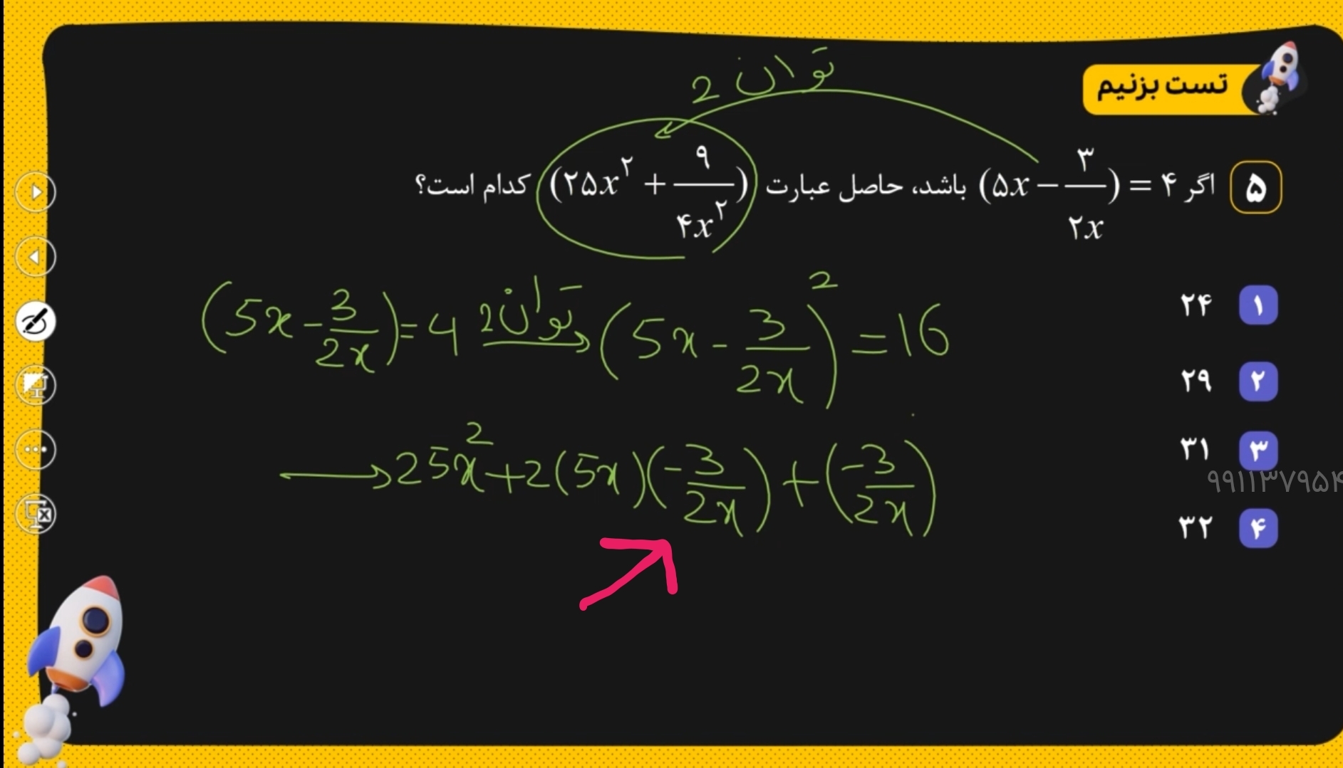 جواب میشه عدد 1 که تو گزینه ها نیست 2 ساعت دارم نگاه میکنم کجا اشتباه کردم که توگزینه ها جوابم نیست. دیدم کلا جواب ها اشتباه هست استاد اشتباه حل کردن. تو باز کردن اتحاد مربع به جای منفی ab مثبت ab درنظر گرفتن.