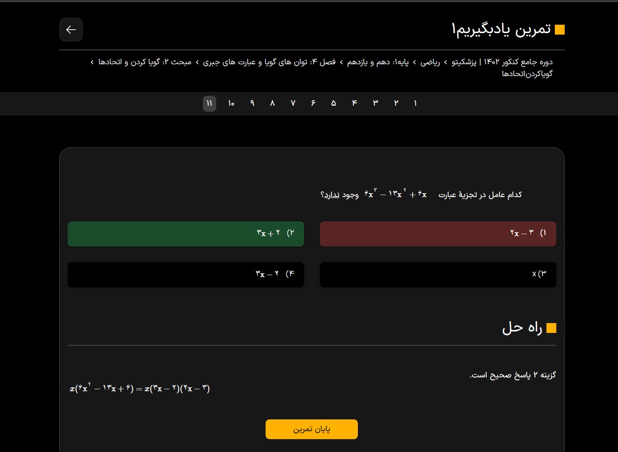 سلام توی تمرین های لین بخش سوال آخر ینی سوال 11، بعد از اینکه از ایکس فاکتور گرفت، داخل پرانتز و چجوری تجزیه کرد؟ من خودم نتونستم تشخیص بدم