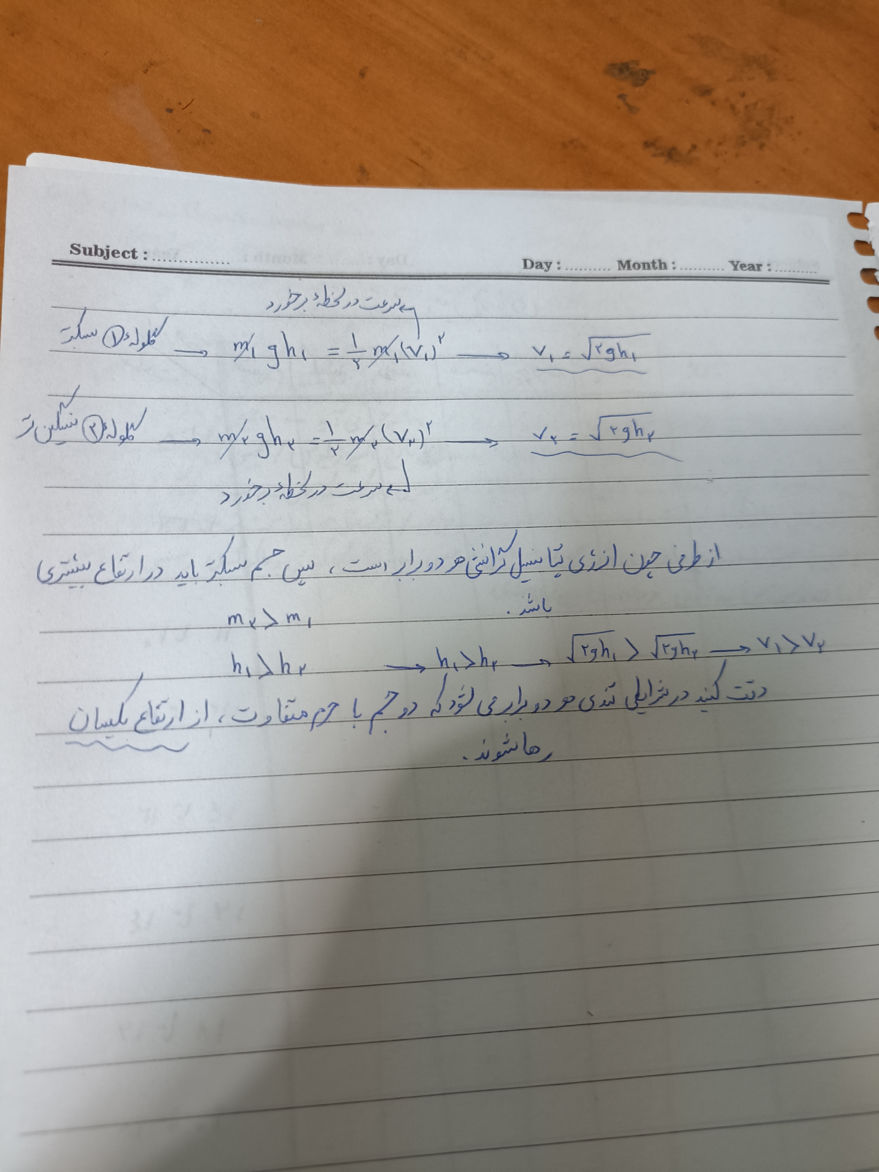 @سید محمد متین رشادی اخه اقای رشادی استاد مگه نگفتن که سرعت جسم در لحظه رسیدن فقط به سرعت اولیه و ارتفاع بستگی داره و به جرم هیچ بستگی نداره اما شما یه چیز دیگه میگید