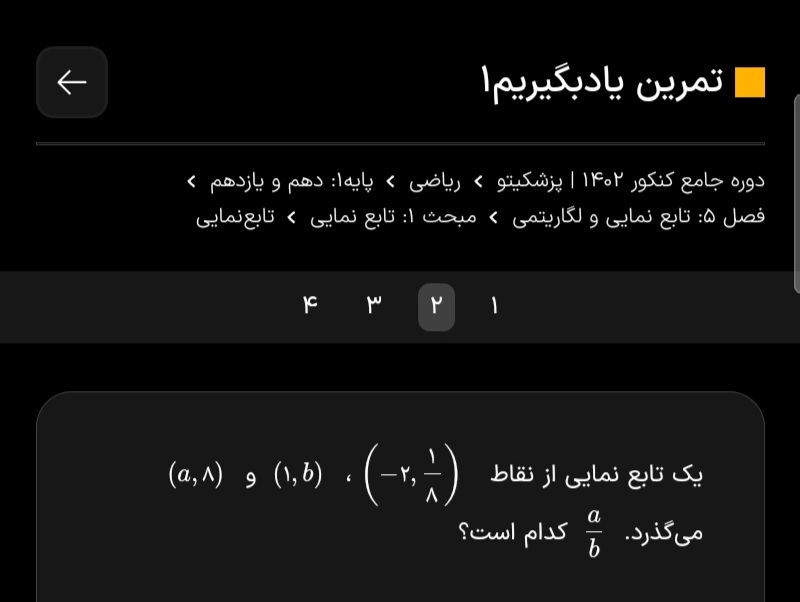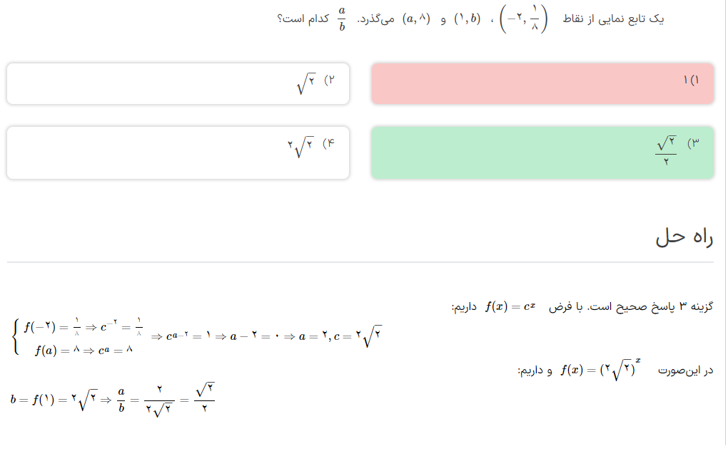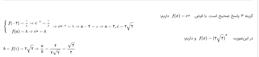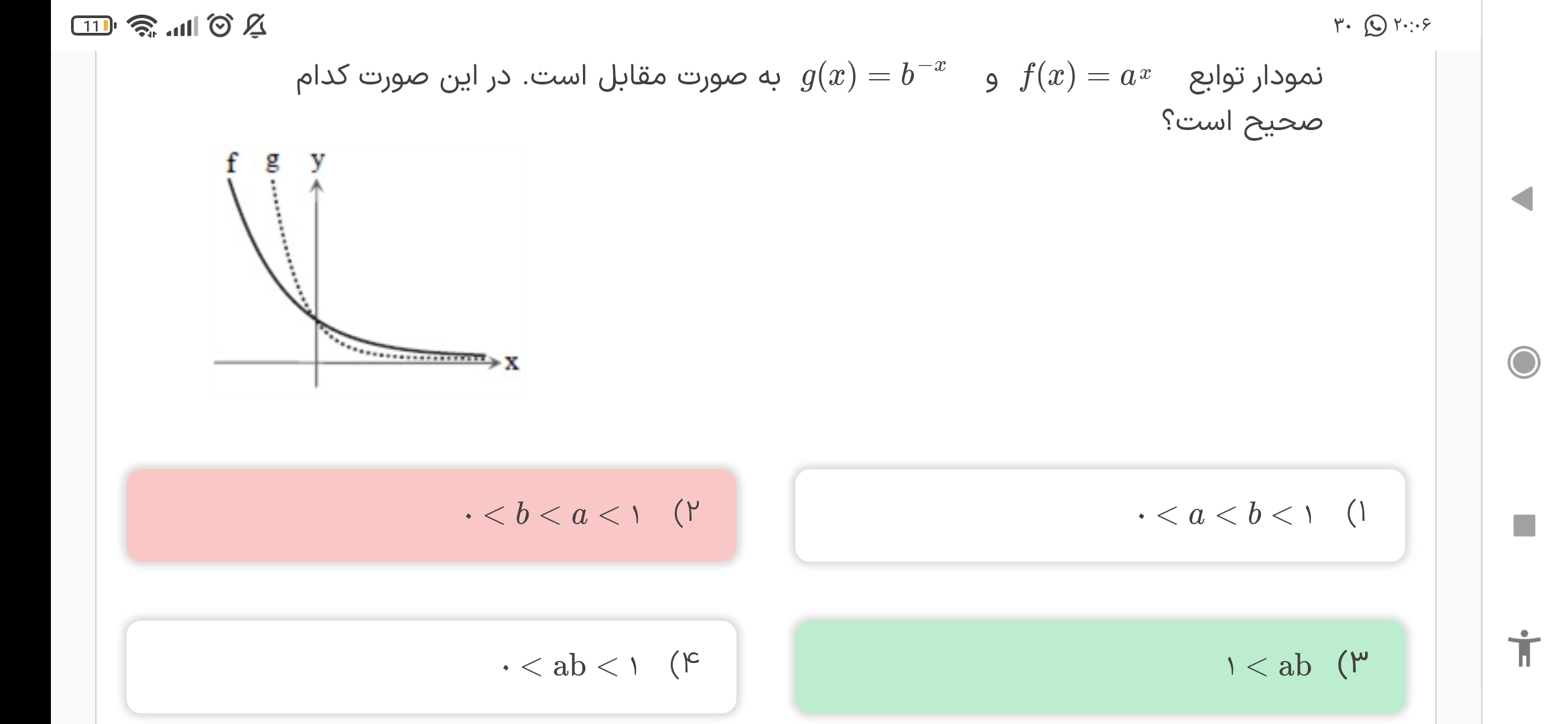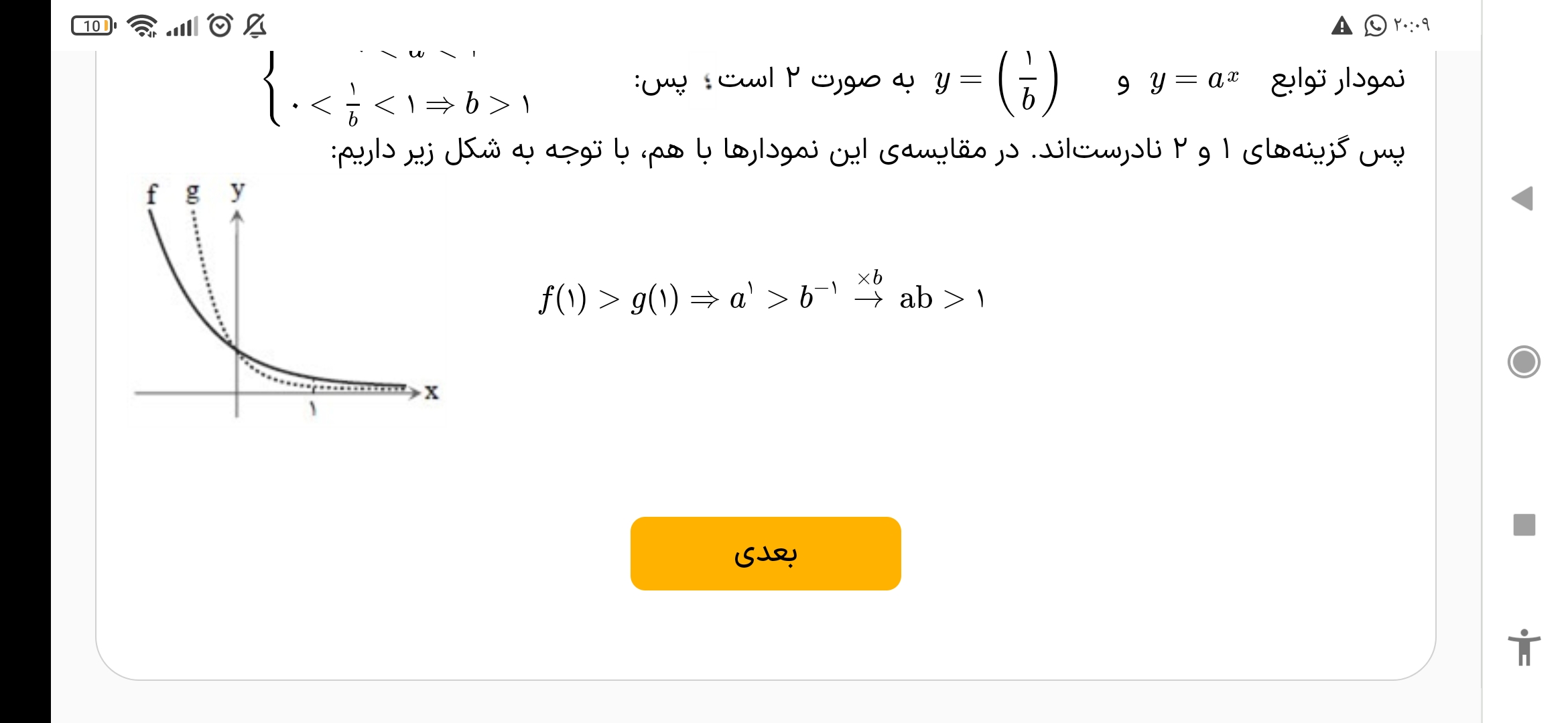 سلام وقت بخیر عذرخواهی میکنم بابت تاخیر متوجه سوالتون نشدم تابع نمایی مثلا c به توان x اگر c بزرگتر از 1 باشه نمودارش صعودیه ولی اگر تابع نمایی دیگری مثل t به توان x داشته باشیم و t بین 0 و 1 باشه نمودارش نزولیه در اینجا هر دو نمودار نزولی ان و اگر اون منفی کنار توان رو نداشتیم اون گزینه ای که شما انتخاب کردین درست میشد . ولی ما در کنار توان b یه منفی داریم و درواقع میتونیم بگیم 1/b به توان x رو داریم . حالا همونطور که از نمودار ها مشخصه a > 1/b عه و در نتیجه ab > 1 هستش .