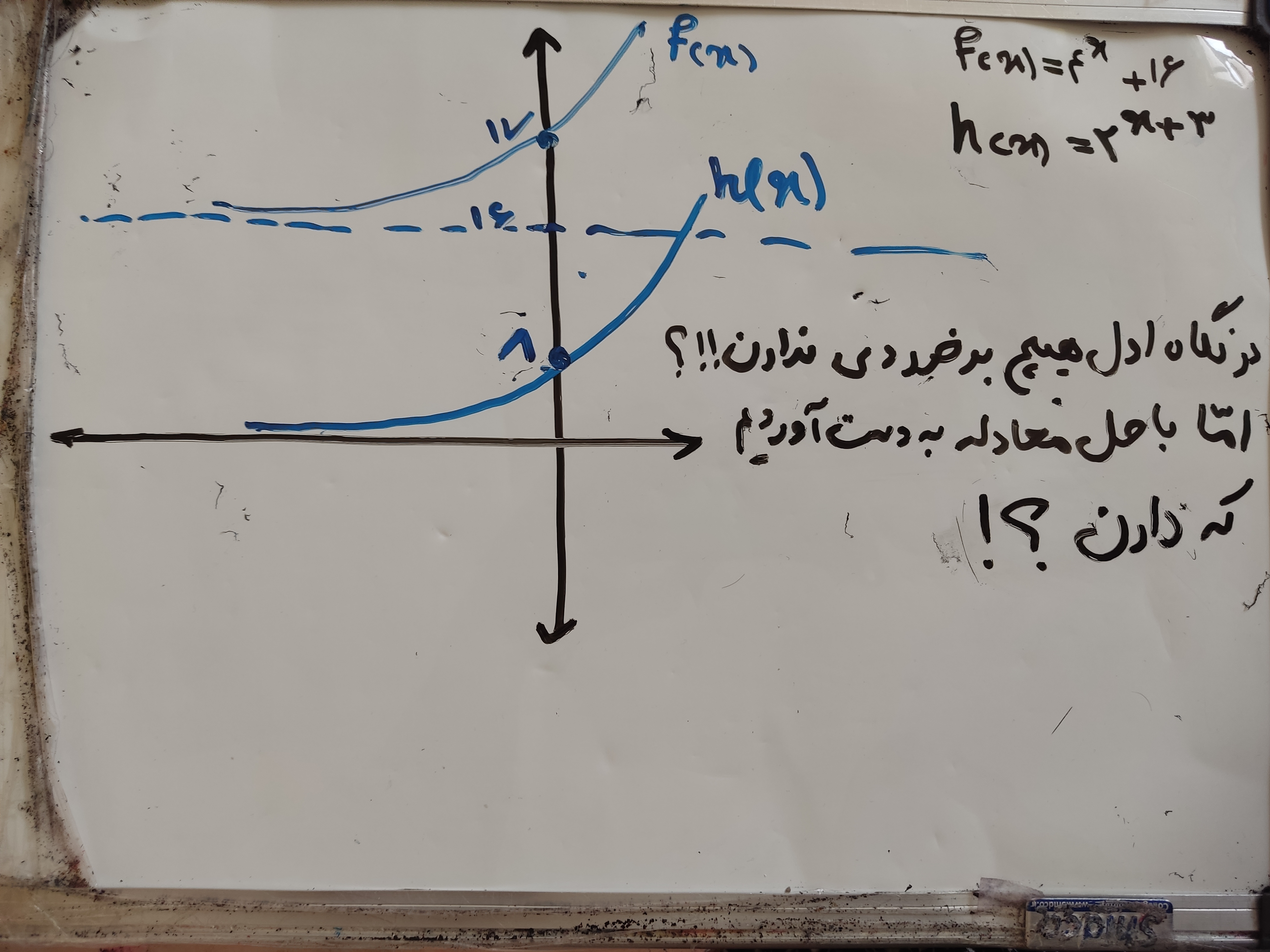 @سید محمد مبین حسینی ببین رفیق شما نمیتونی در چنین سوالی که ما تغییر متغیر انجام میدیم بیای و از اول نمایی ها رو رسم کنی شما میتونی نمودار معادله به شکل t رو رسم کنی ولی در این شکل از رسم کردن ، همون‌طور که میبینی در ظاهر برخوردی ندارن چون شکل رو بد رسم میکنیم و دقیق نیست اینکه بخوای دو تا نمایی رو رسم کنی و دقیق نقطه برخورد بدست بیاری یکم دور از واقعیته