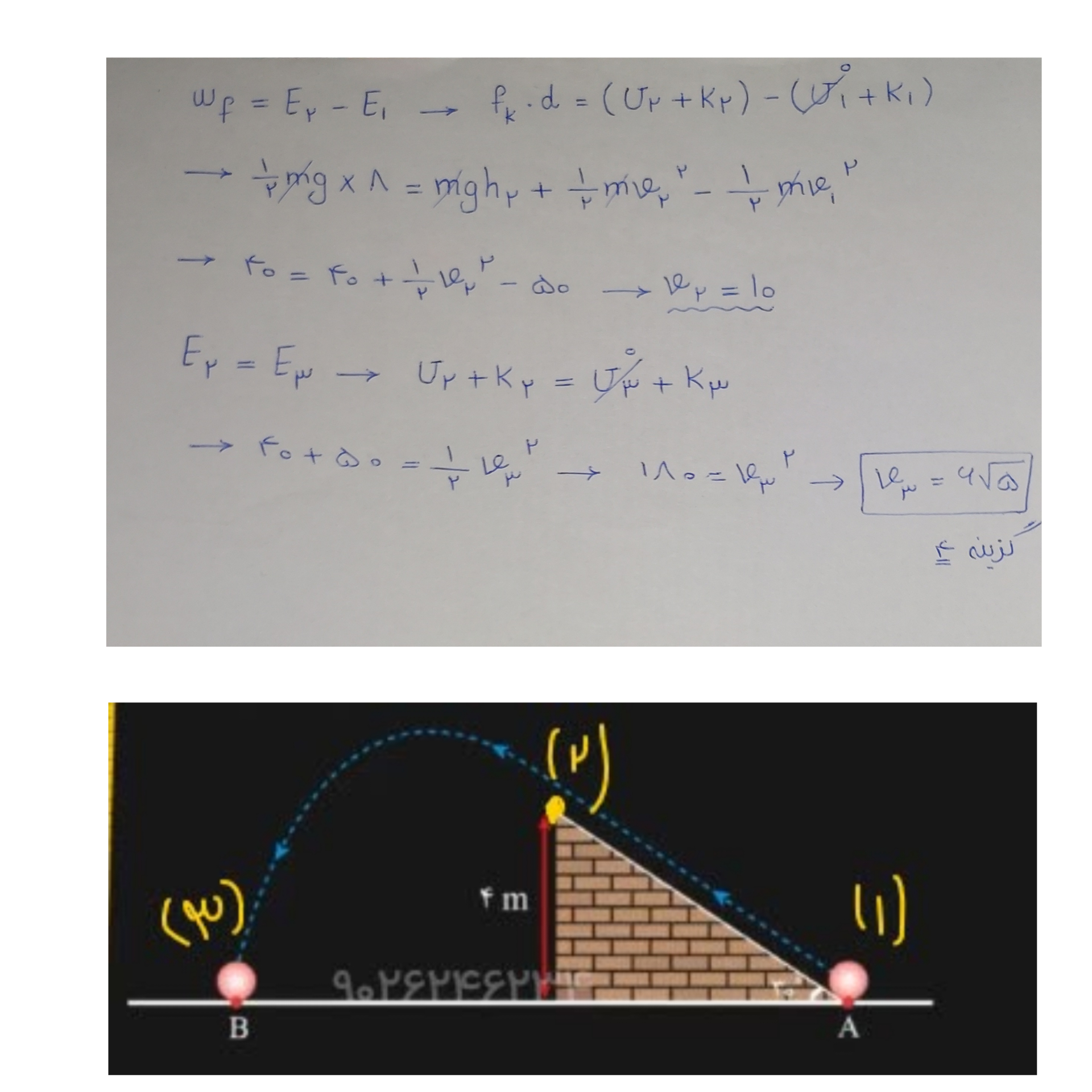 سلام من اون طرف تساوی به جای اینکه بنویسم کار نیروی اصطکاک نوشتم کار نیروی وزن و جواب همین منفی ۴۰ در اومد شانسی بود؟