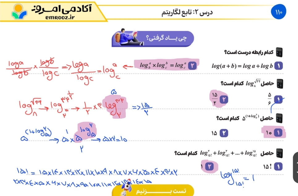 سلام وقت بخیر، چرا استاد اینجا رادیکال پنج رو هم به توان 2 رسوندن؟ مگه نباید توان عدد 9 رو ببریم پشت لگاریتم و جواب دوتا رادیکال پنج بشه؟