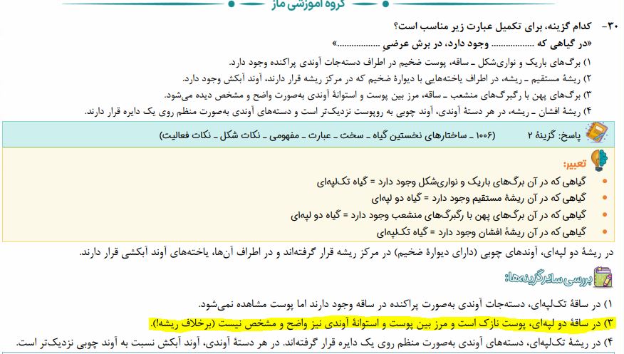 سلام ولی درمورد گزینه 1 استاد خودشون در درسنامه گفته بودن که مرز بین پوست و استوانه آوندی در ساقه دو لپه یک مرز واضح و مشخص نیست و یک مرز فرضی هستش...تازه گفته بودن که ساقه تک لپه اصلا استوانه آوندی نداره... پس چطور گزینه 1 درست میشه