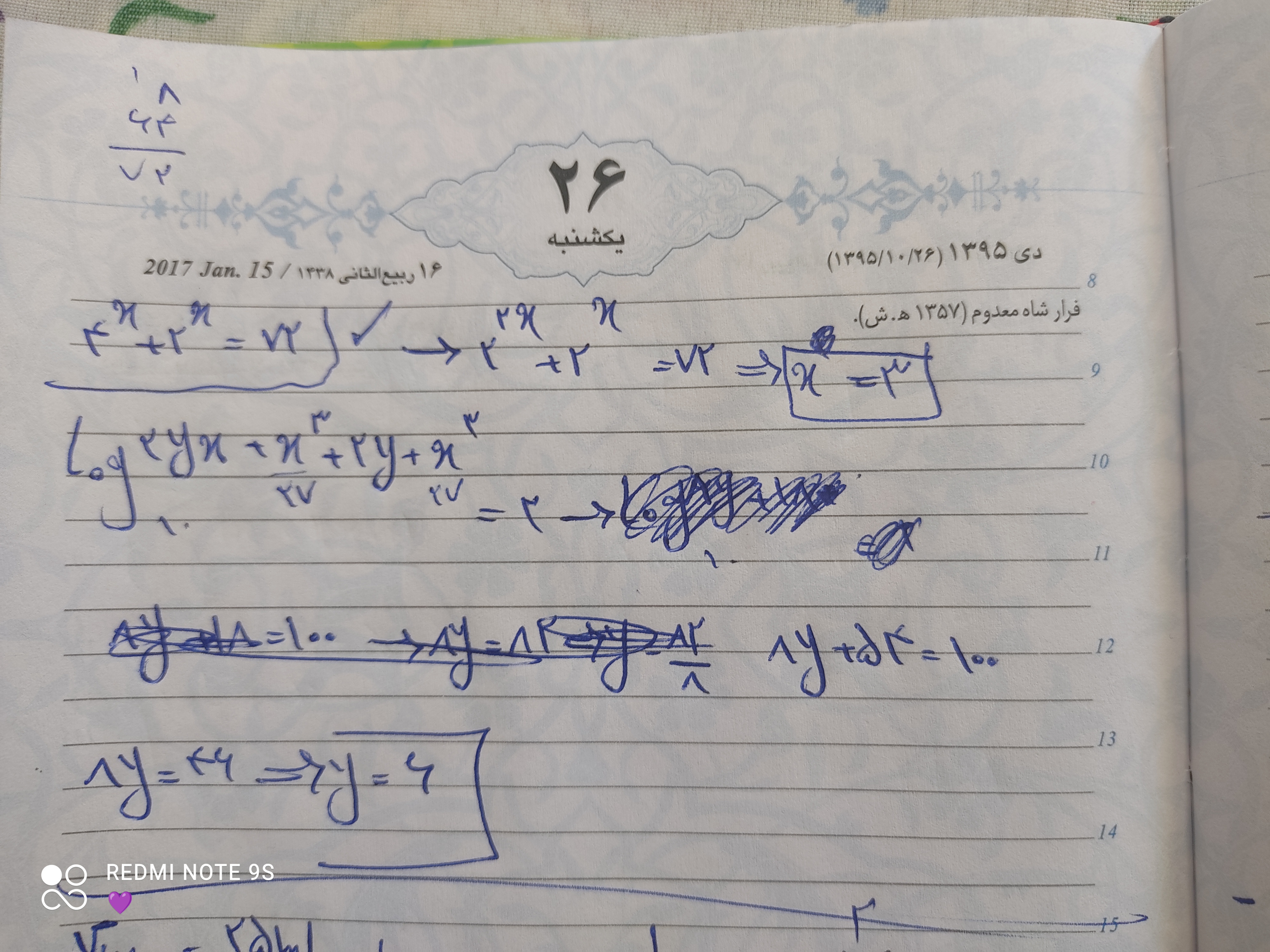 سلام من قبل از اینکه x رو بدست بیارم لگاریتم هارو ضرب کردم بعد از اینکه x رو بدست اوردم توش جایگذاری کردم ولی جوابم ۶ بدست اومد