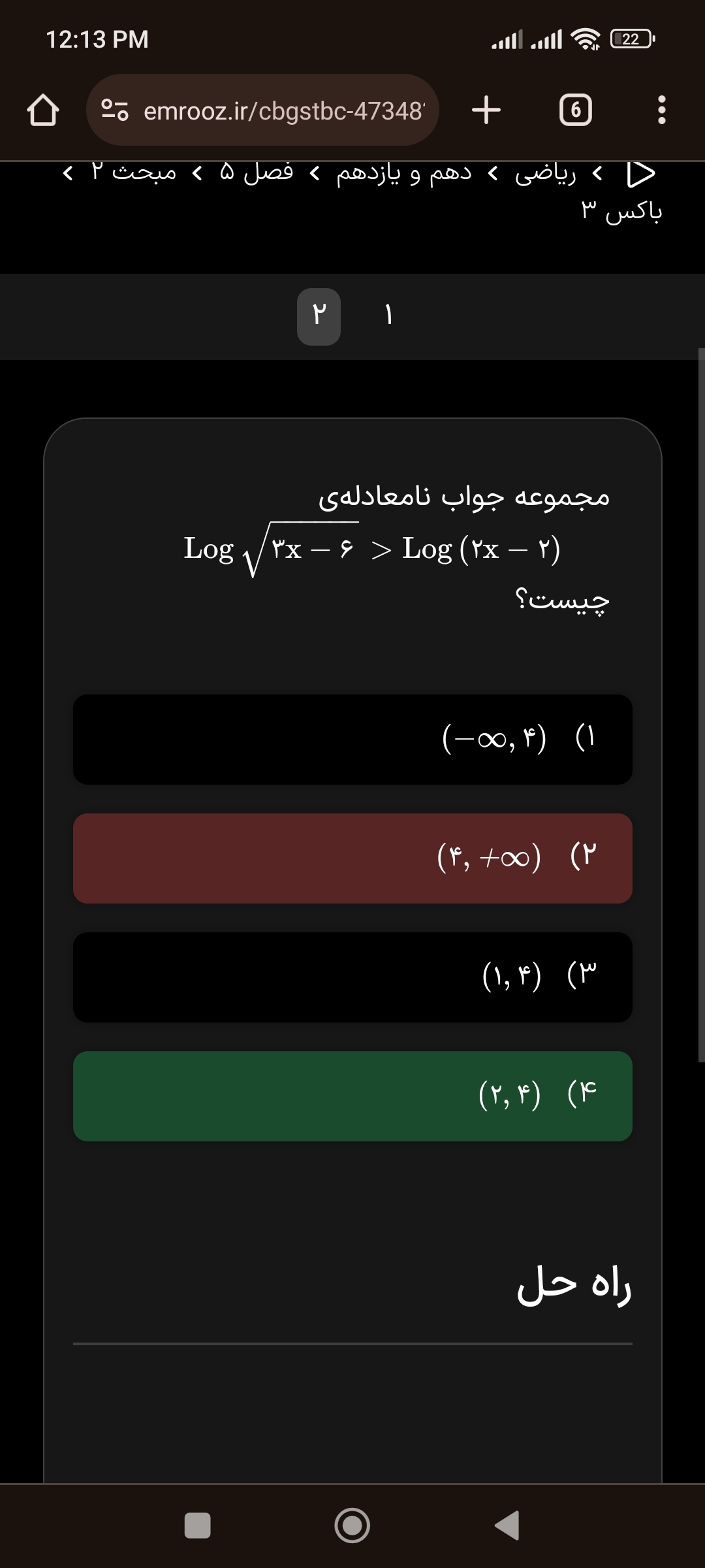 سلام ببخشید تو چی یادگرفتی برای چک کرد دامنه برای عدد جلوی لگاریتم میایم میگیم x>0 و 3>0 و تو حل هم ب این میرسیم ک x <3 باشه بعد میایم اشتراک میگیریم بینشون؟ و میشه گزینه دو درسته؟