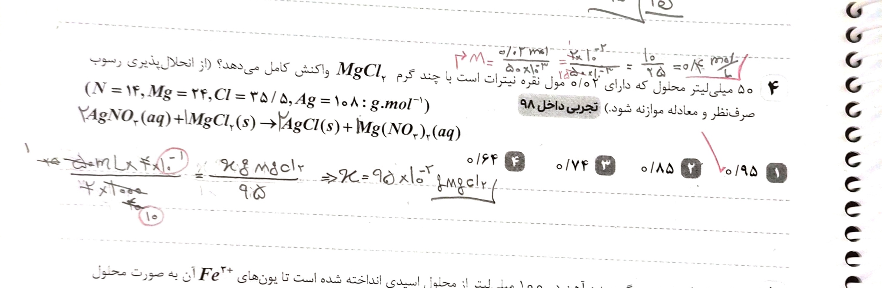 @نگین ابراهیمی سلام ۴ ضرب در ده به توان منفی یک همون مولار.... ۲ صدم مول رو تقسیم بر ۵۰ میلی لیتر میکنیم که مولار بدست بیاد و در نهایت جواب میشه ۴ دهم