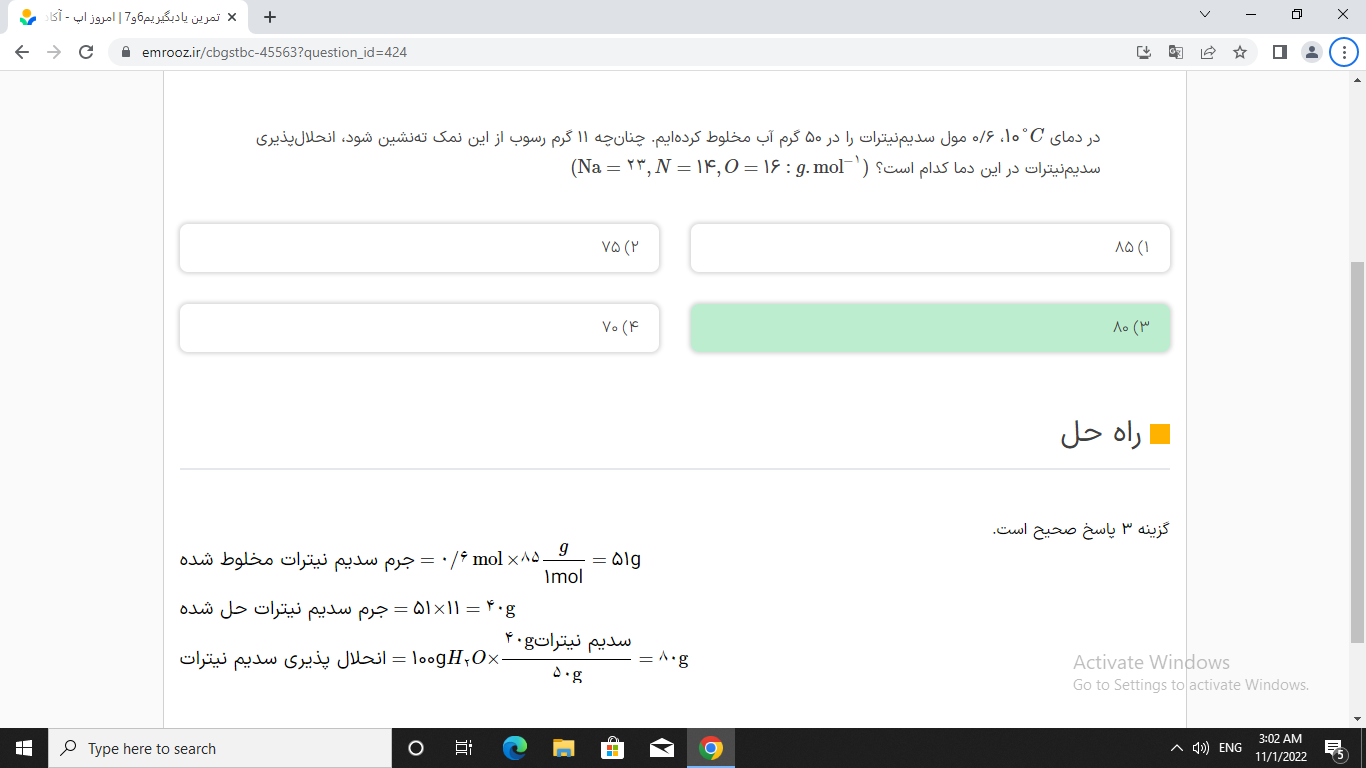 @مریم یاری سلام عزیزم :) باید علامت منفی باشه. ۴۰=۱۱-۵۱ ۵۱ گرم در آب ریختیم‌ و ۱۱ گرم حل نشده. پس ۴۰ گرم حل شده.
