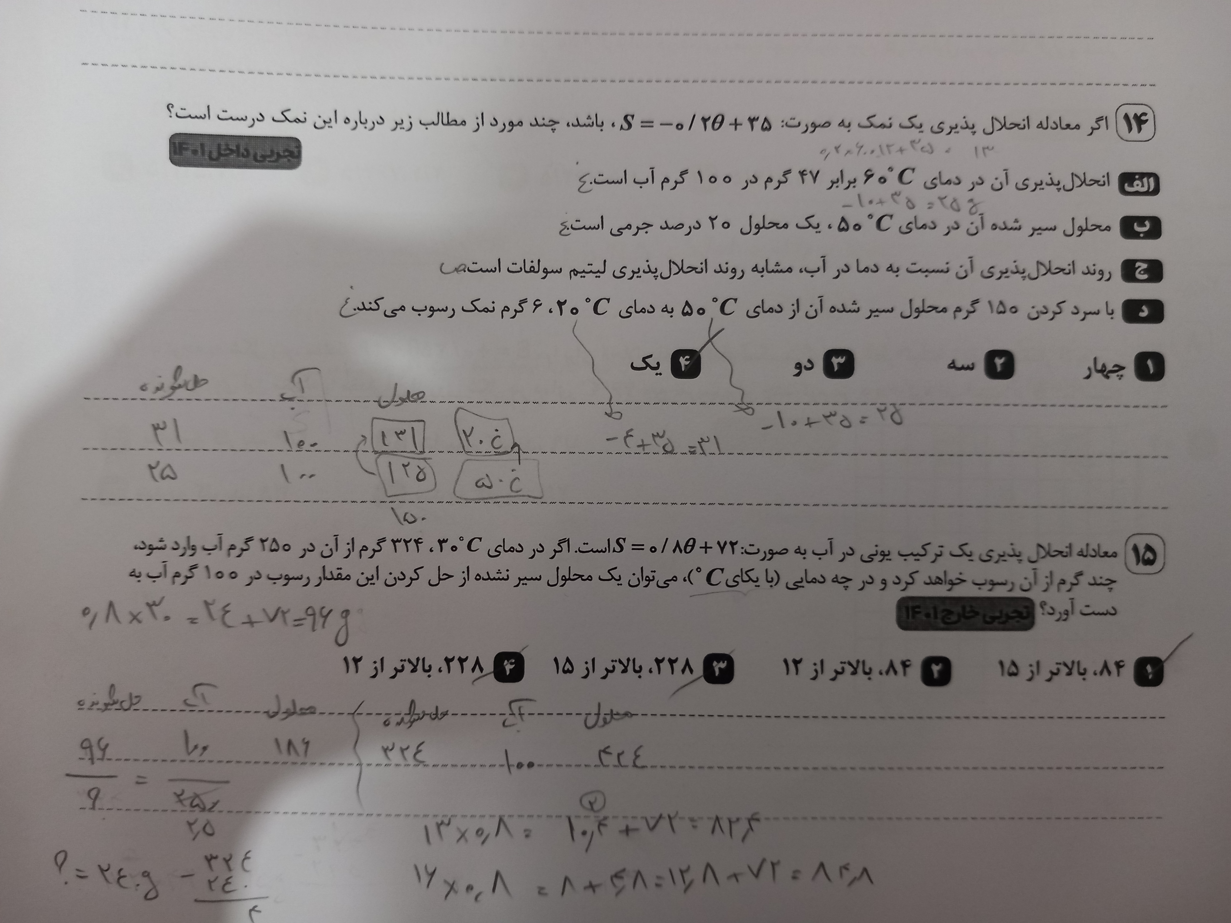 سلام دوست عزیز بله اگر که احیانا با تست های کنکور جدید مواجه شدید که انحلال پذیری سختی داشت حل اون سوال رو به ذهن بسپارید اما خوب روتین و استاندارد سوال های انحلال پذیری در همین حد هست