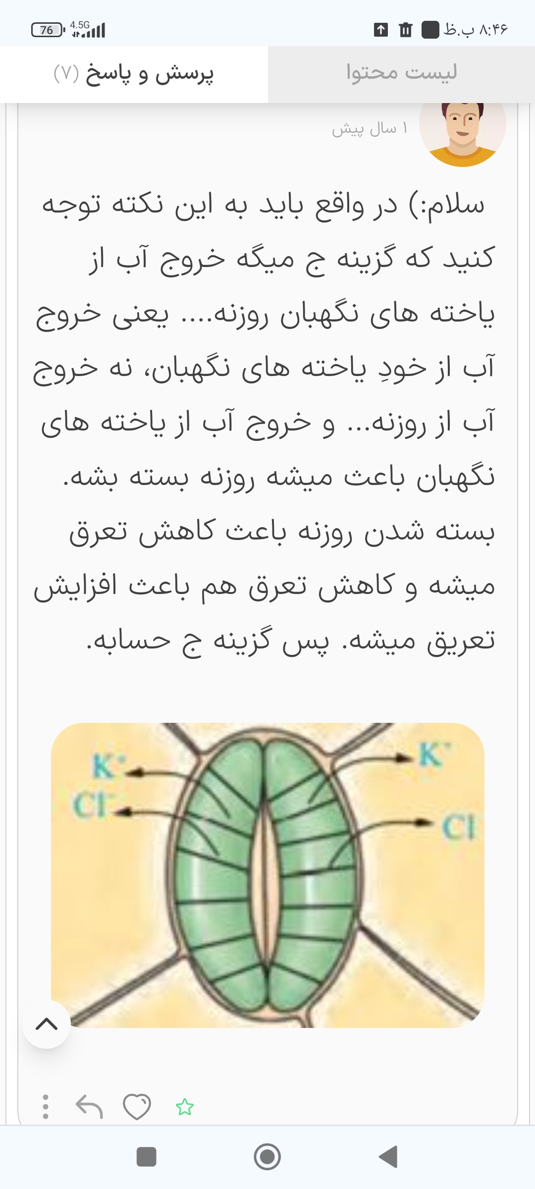 سلام:) در واقع باید به این نکته توجه کنید که گزینه ج میگه خروج آب از یاخته های نگهبان روزنه.... یعنی خروج آب از خودِ یاخته های نگهبان، نه خروج آب از روزنه... و خروج آب از یاخته های نگهبان باعث میشه روزنه بسته بشه. بسته شدن روزنه باعث کاهش تعرق میشه و کاهش تعرق هم باعث افزایش تعریق میشه. پس گزینه ج حسابه.