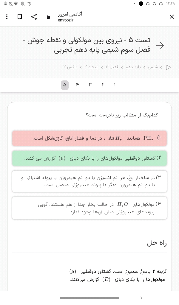 حالا گزینه سه اگه گفته بود هرمولکول آب با 4مولکول دیگر آب با پیوند هیدروژنی متصل است درست بود ؟ بیشتر منظورم برا این هست که گفت هر مولکول به 4 مولکول دیگر