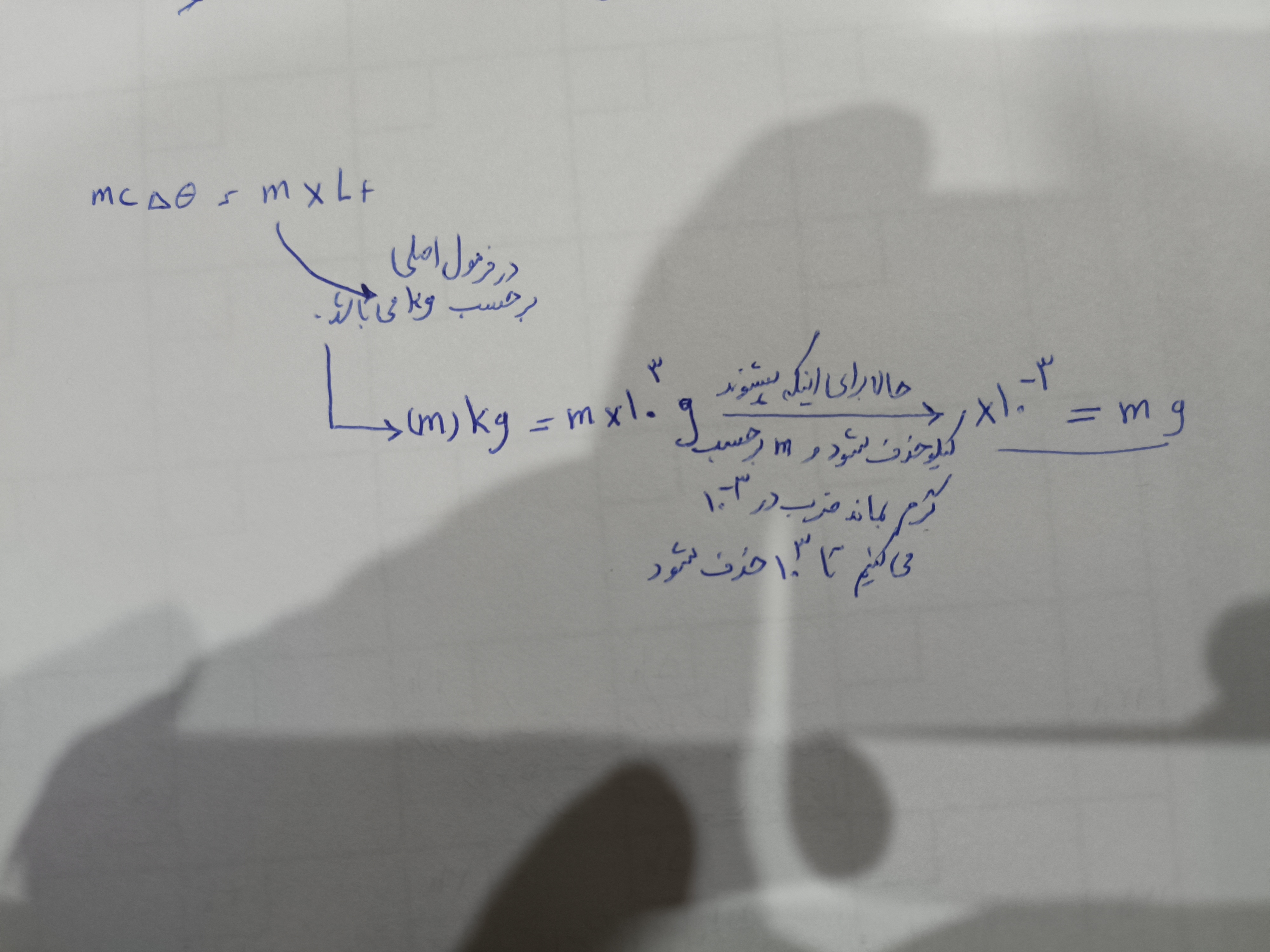 استاد مستقیم توی معادله عدد m رو بر حسب کیلو گرم در نظر گرفت و توی همون معادله در ده به توان منفی سه ضرب کرد که به گرم باشه ولی یه مقدار گیج کنندست و درکش سخته شما میتونید از همون اول ضربدر هزار کنید و بر حسب گرم در معادله قرار بدید