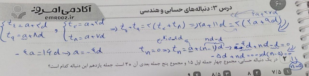 سلام راه حل دیگه ای که براش هست خیلی متفاوت نیست فقط میتونیم از عبارت a+4d=0 به تساوی a=-4d برسیم و بعدش جمله عمومی دنباله یعنی a+d(n-1) رو بازنویسی کنیم و به جای a بزاریم -4d و در نهایت به nd + -5d برسیم و از اونجا بگیم n=5