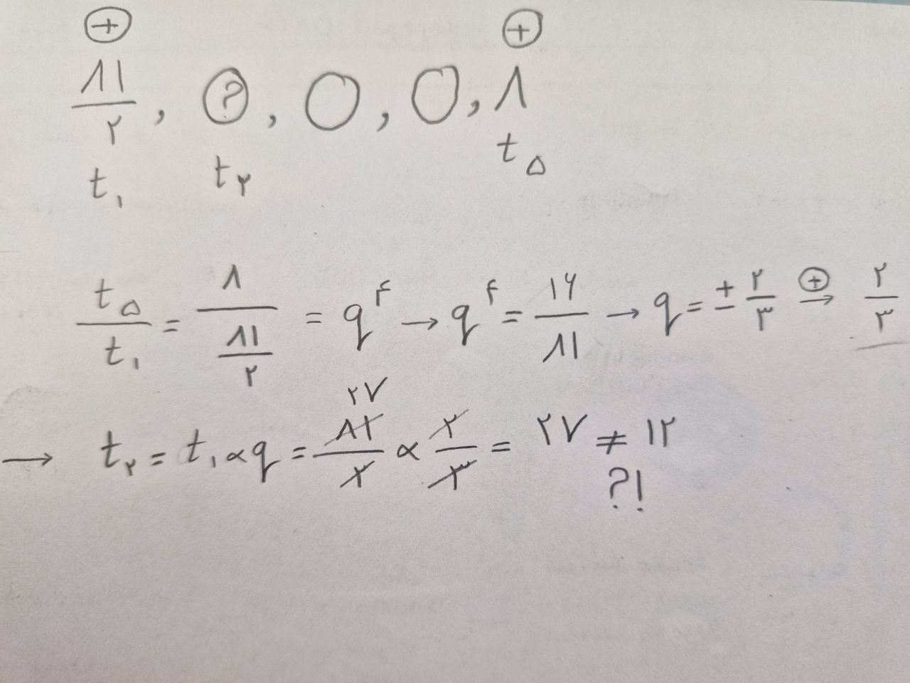 @سیدامیر جزایری موسوی دلیل مثبت بودن قدر نسبت میتونه گزینه ها باشه چون در هر چهار گزینه برای جمله دوم که یه جمله زوجه یه عدد مثبت گفته پس میتونیم نتیجه بگیریم هم جملات فرد و هم زوج هر دو مثبتن و در نهایت یعنی قدر نسبت هم مثبته