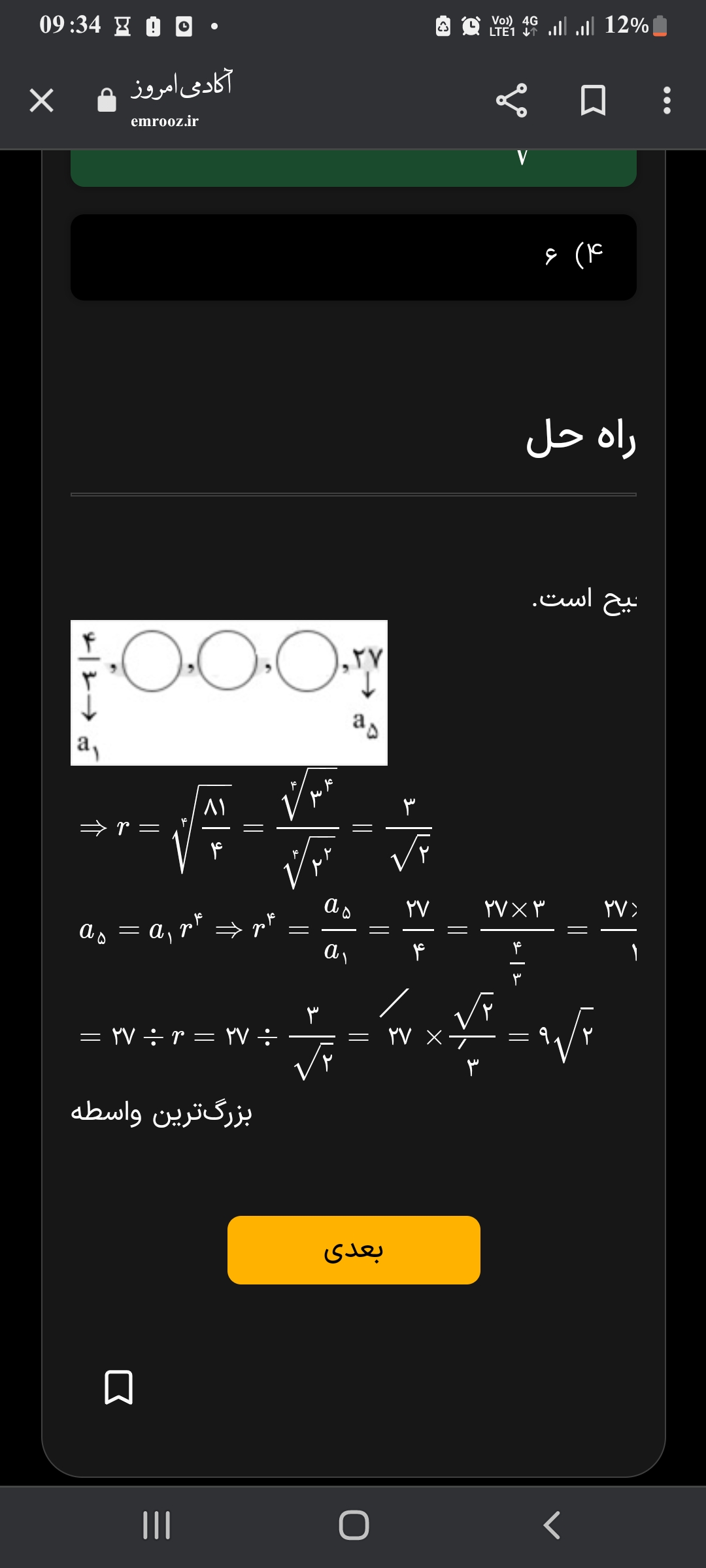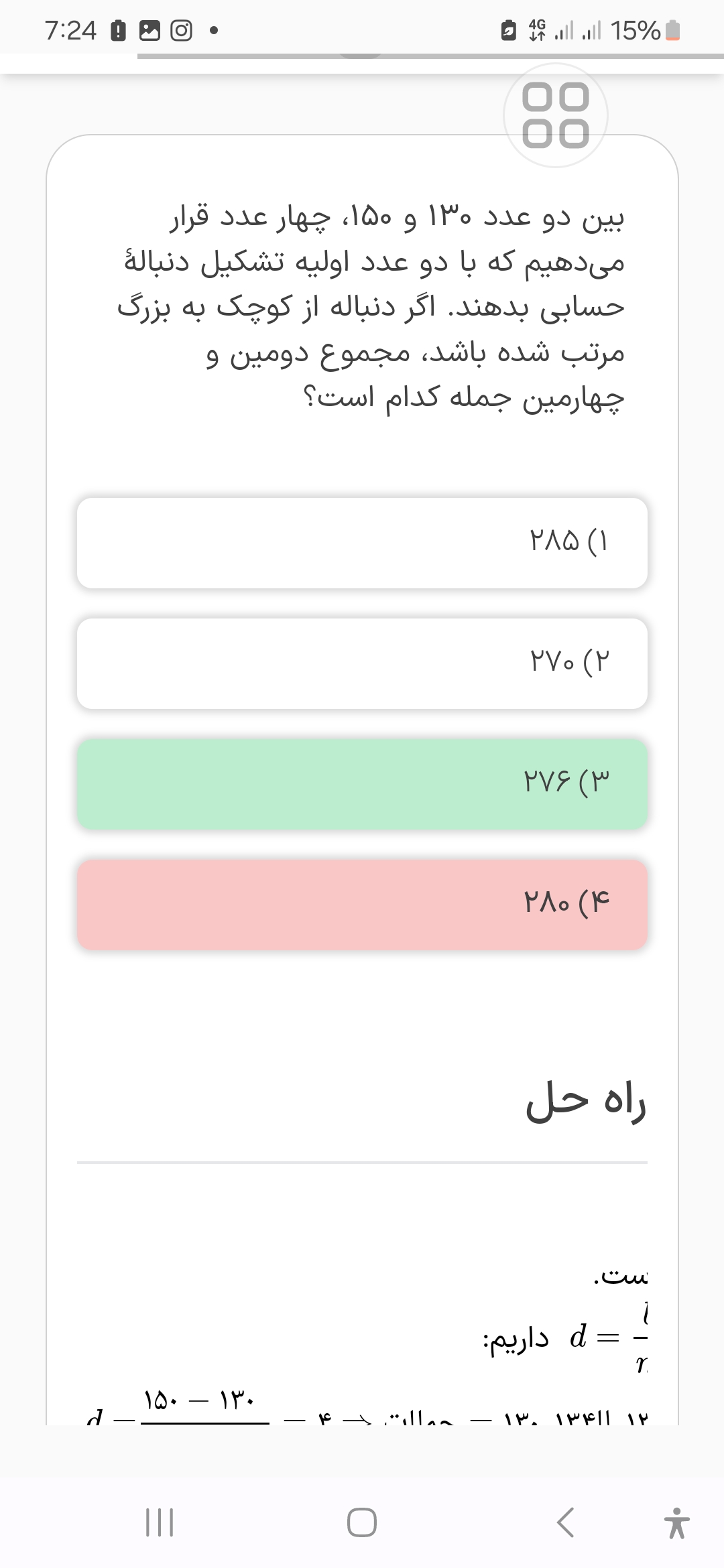 سلام . خسته نباشید . ببخشید تو این تست اگه جمله هایی که دنباله هندسی میسازن ، بیشتر از سه تا باشن چیکار کنیم ؟ الان که سه تا هست ، اختلاف سومی و دومی تو صورت ، اختلاف دمی و اولی تو مخرج میزاریم . ولی اگه بیشتر از سه تا بود چی؟ مثلا اگه پنج تا جمله از دنباله حسابی ، یه دنباله هندسی تشکیل بدن . اختلاف پنجمی و چهارمی تو صورت ، اختلاف چهارمی و سومی تو مخرج میزاریم . بقیش و چیکار کنیم ؟ 🤷🏻‍♀️