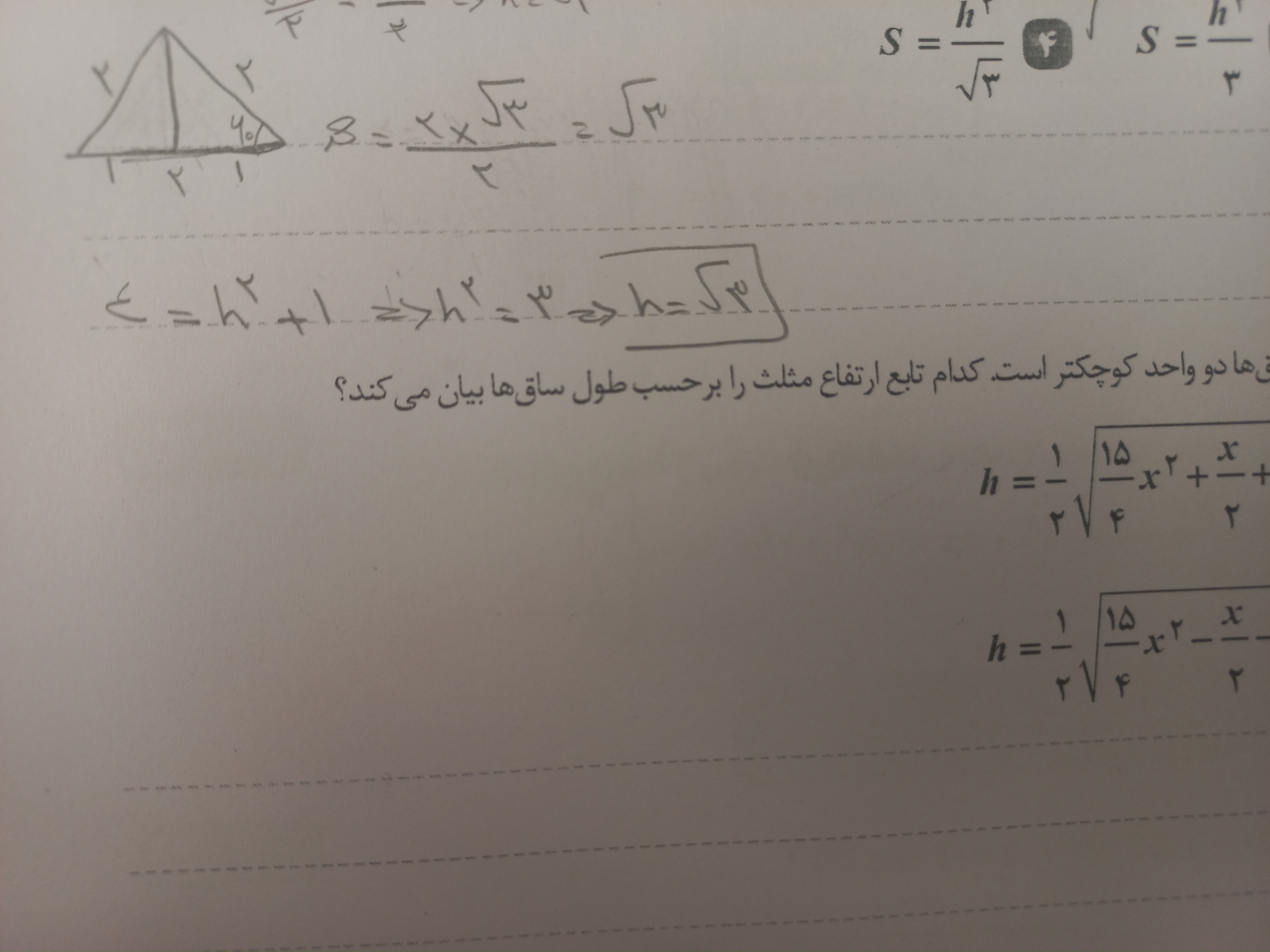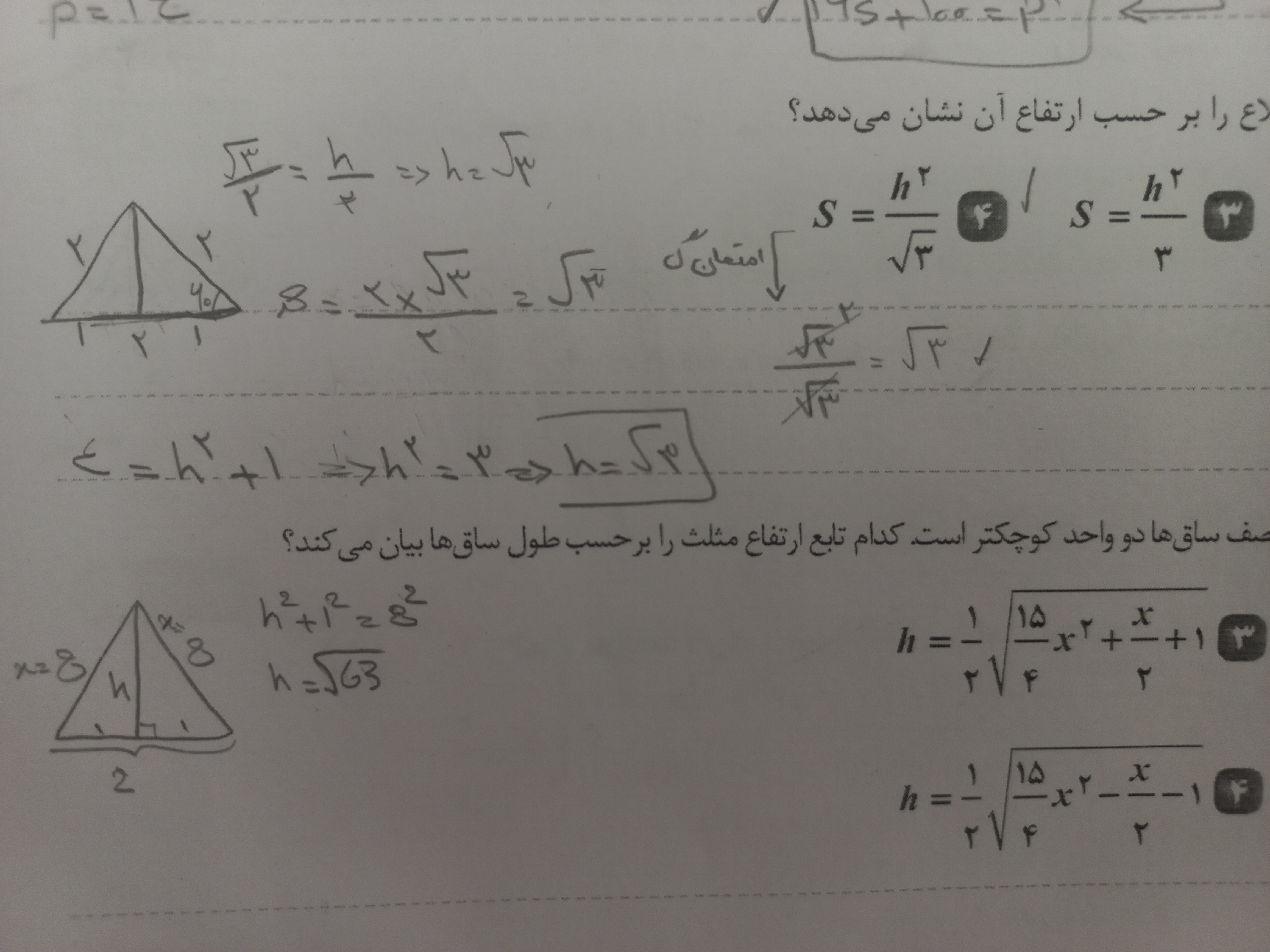 سلام و درود بدست اومد دیگه در گزینه چهارم شما بجای ارتفاع بذاری رادیکال سه مساحتت هم میشه رادیکال سه پس جواب میشه گزینه چهارم