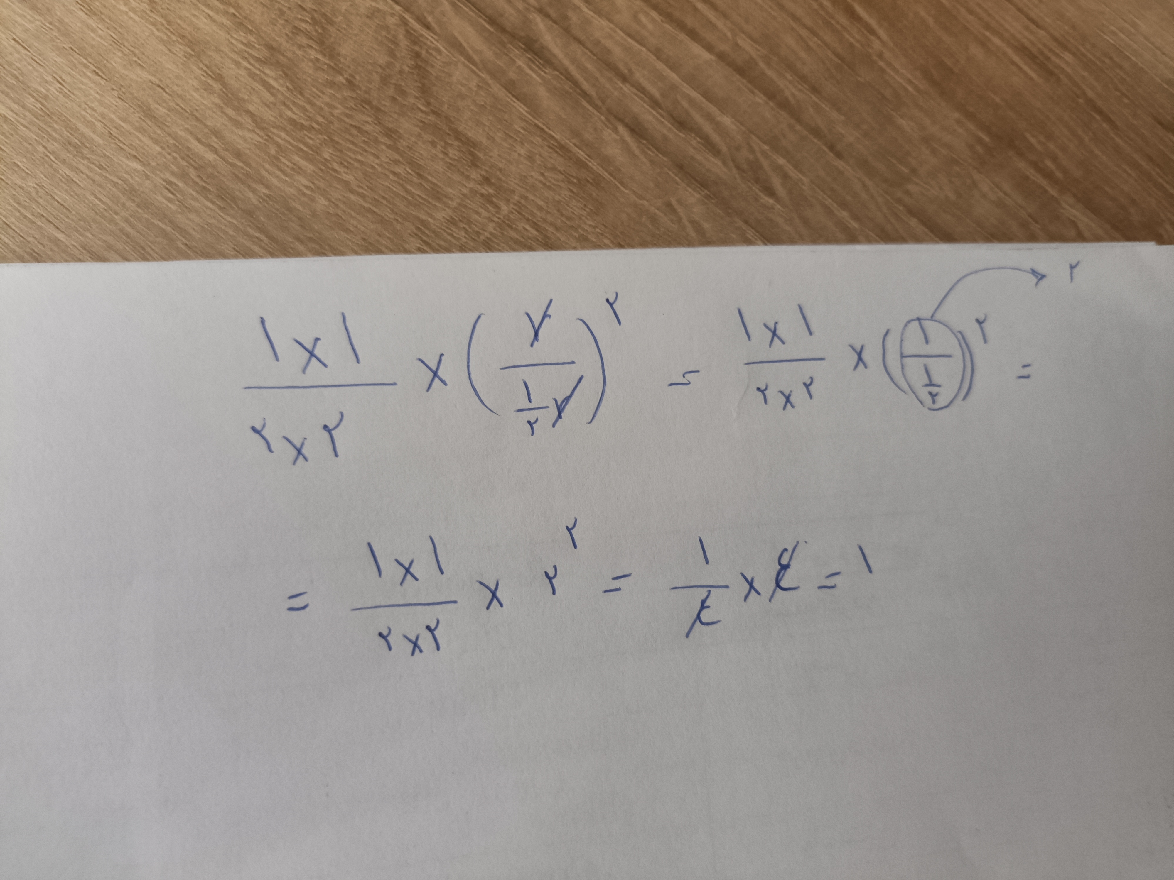 یک دوم یک نشد در واقع یک تقسیم بر یک دوم شد دو و بعدش به توان دو رسید و شد چهار و با چهاری که در مخرج یک چهارم بود زده شد و در آخر جواب شد یک