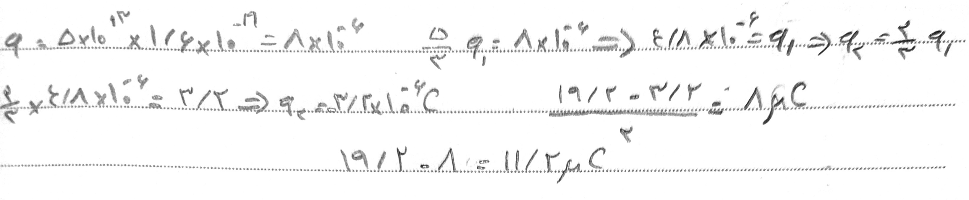 سلام میشه بگید چرا جواب این سوال 8 نمیشه و 11.2 میشه 😕💔 کره رسانایی دارای بار الکتریکی مثبت است. اگر 5 در 10 به توان 13 الکترون به کره بدهیم بار کره منفی و اندازه بار منفی آن دو سوم اندازه بار بار اولیه اش میشود در این حالت اگر این کره را به کره ای مشابه که دارای بار 19.2 میکرو کولن است اتصال دهیم چند میکرو کولن بار از یکی به دیگری منتقل میشود ؟؟؟؟