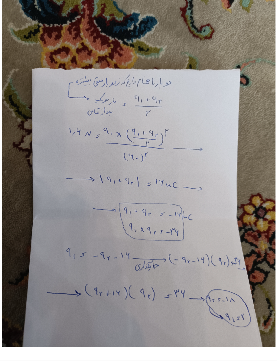 نمیتونیم رد گزینه رو از قسمت اول سوال که نیروی الکتریکی ۰/۹ شده هم بریم ؟ فقط بعد از تماسو باید در نظر گرفت ؟