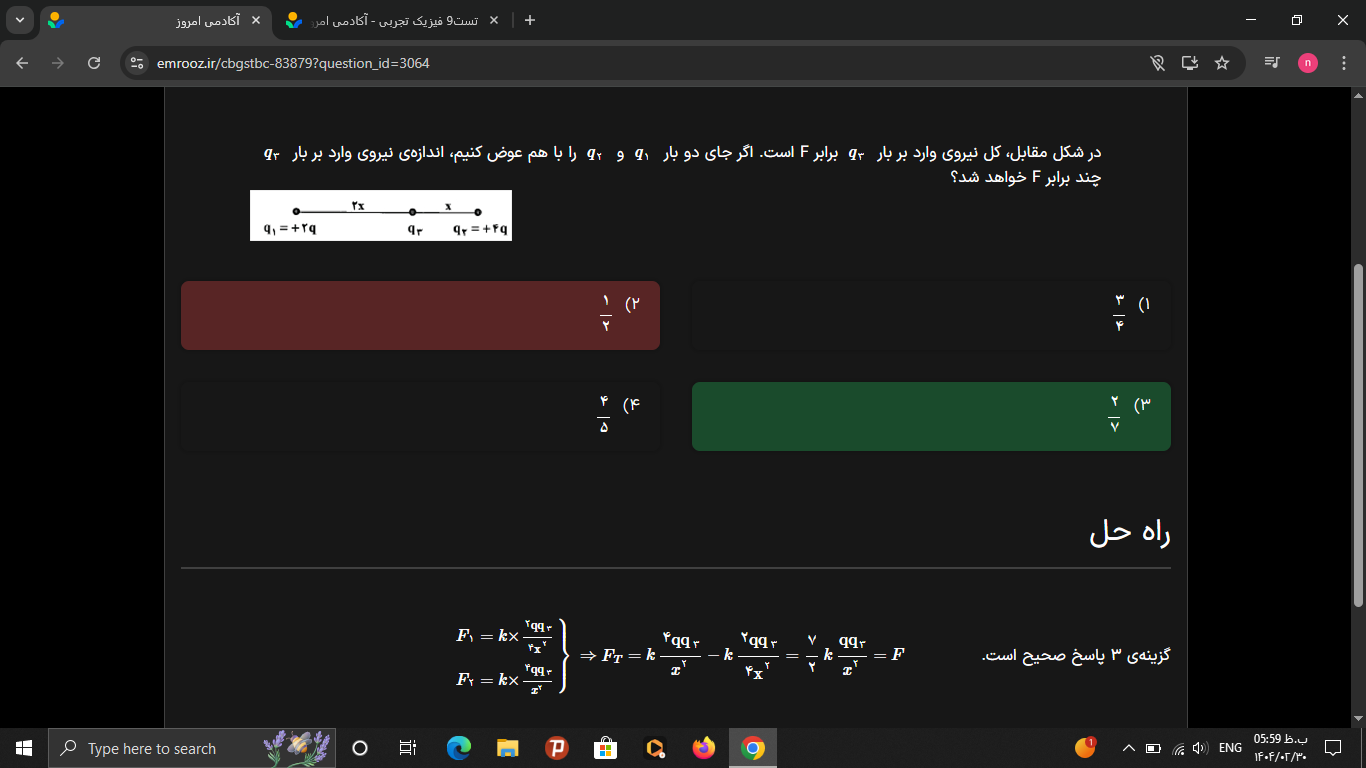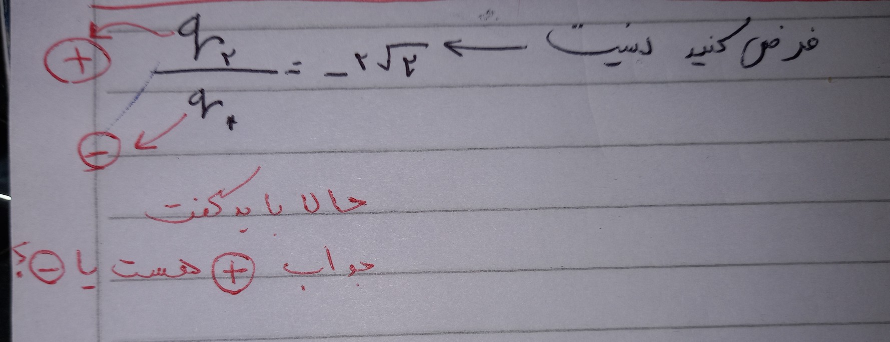 سلام اگر همانطور که در تصویر مشخص کردم نسبت دو بار مختف العلامه در محاسبات منفی بشه باید گفت که این نسبت مثبته یا منفی؟
