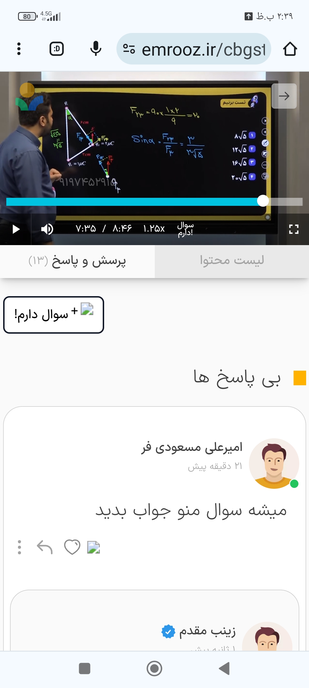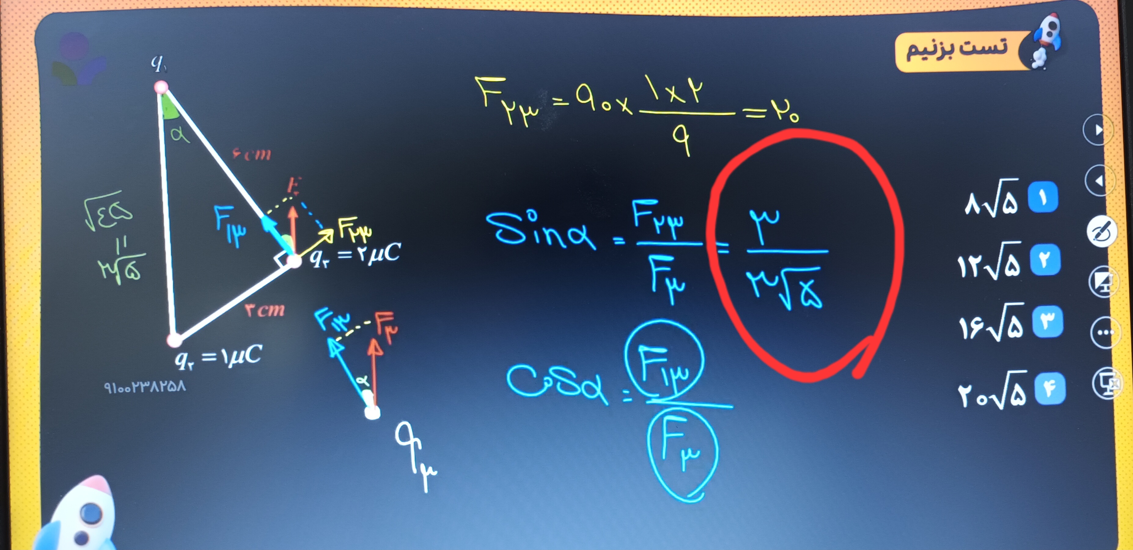 @طهورا عیوضی سلام چون دوتا زاویه الفا با هم برابرن. پس سینوس هاشون هم با هم برابرن. سینوس الفا تو مثلث کوچیکه شد f23 به روی وتر که همون f3 هست و سینوس الفا تو مثلث بزرگه میشه ضلع مقابل زاویه که اندازش سه هست به روی وتر که اندازش سه رادیکال پنج هست. متوجه شدید؟