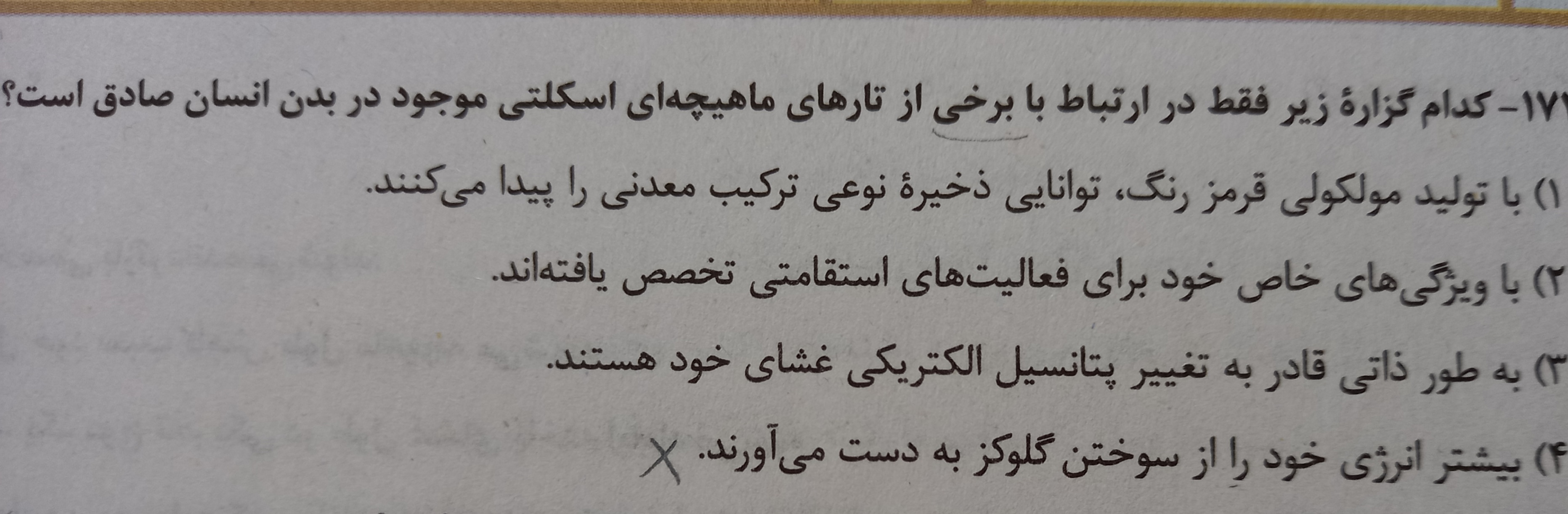 سلام وقت بخیر این تست به نظرمن غلط هست،یعنی هم ۲ و هم ۴ درسته ولی پاسخنامه فقط ۲ رو درست گرفته. برخی تارها مثل کندها بیشتر انرژی شون رو از سوختن گلوکز به دست میارن اگه گزینه ۴، به جای سوختن گلوکز، تجزیه گلوکز میشد، اون وقت غلط میشد. درسته؟