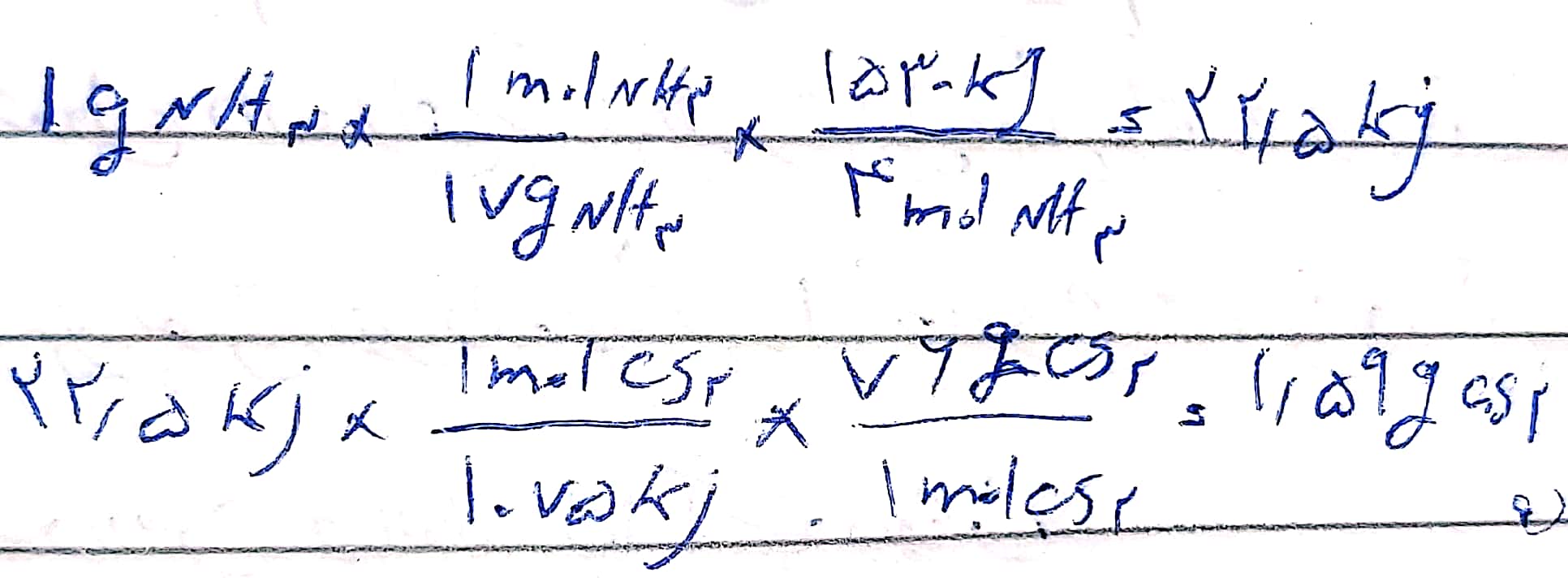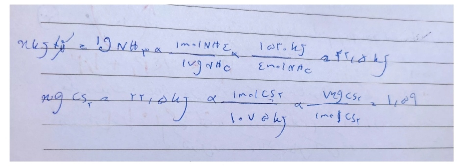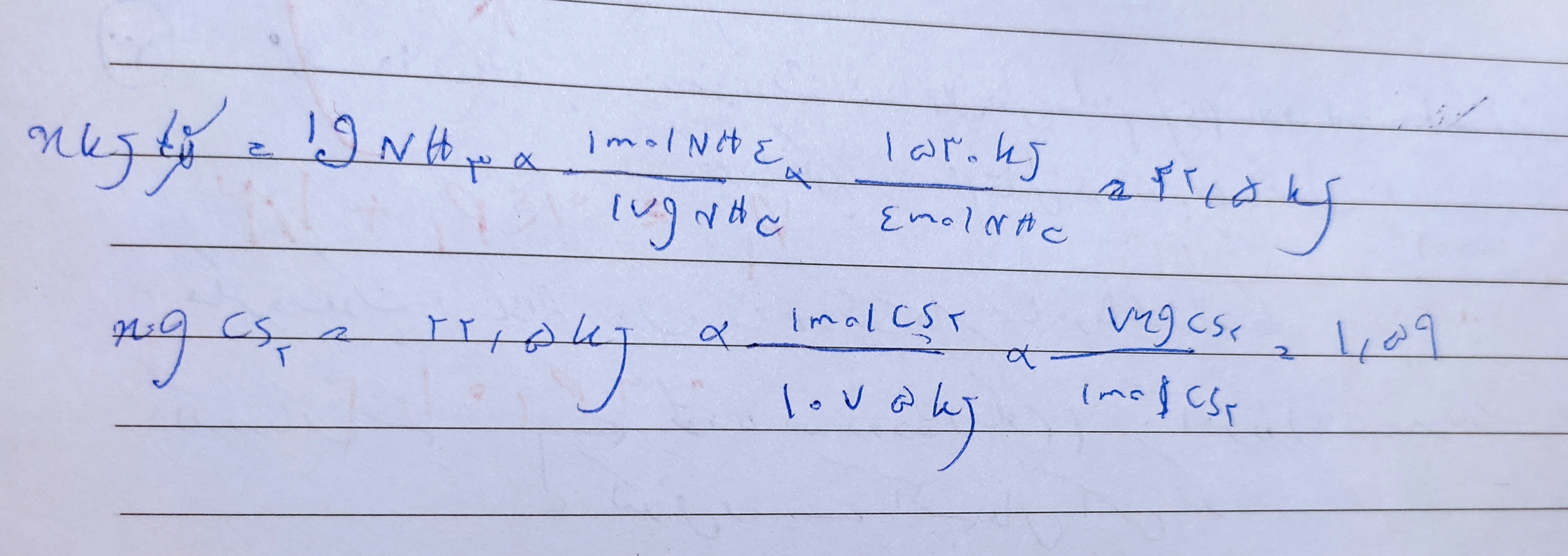 @ناهید عبودی اگر با مفهوم، به روش زنجیره‌ای بخوایم حل کنیم، مثل تصویر زیر میشه. اول گرمای حاصل از سوختن ۱ گرم آمونیک رو محاسبه می‌کنیم. بعد از عدد بدست اومده به جرم کربن‌دی‌سولفید میرسیم.