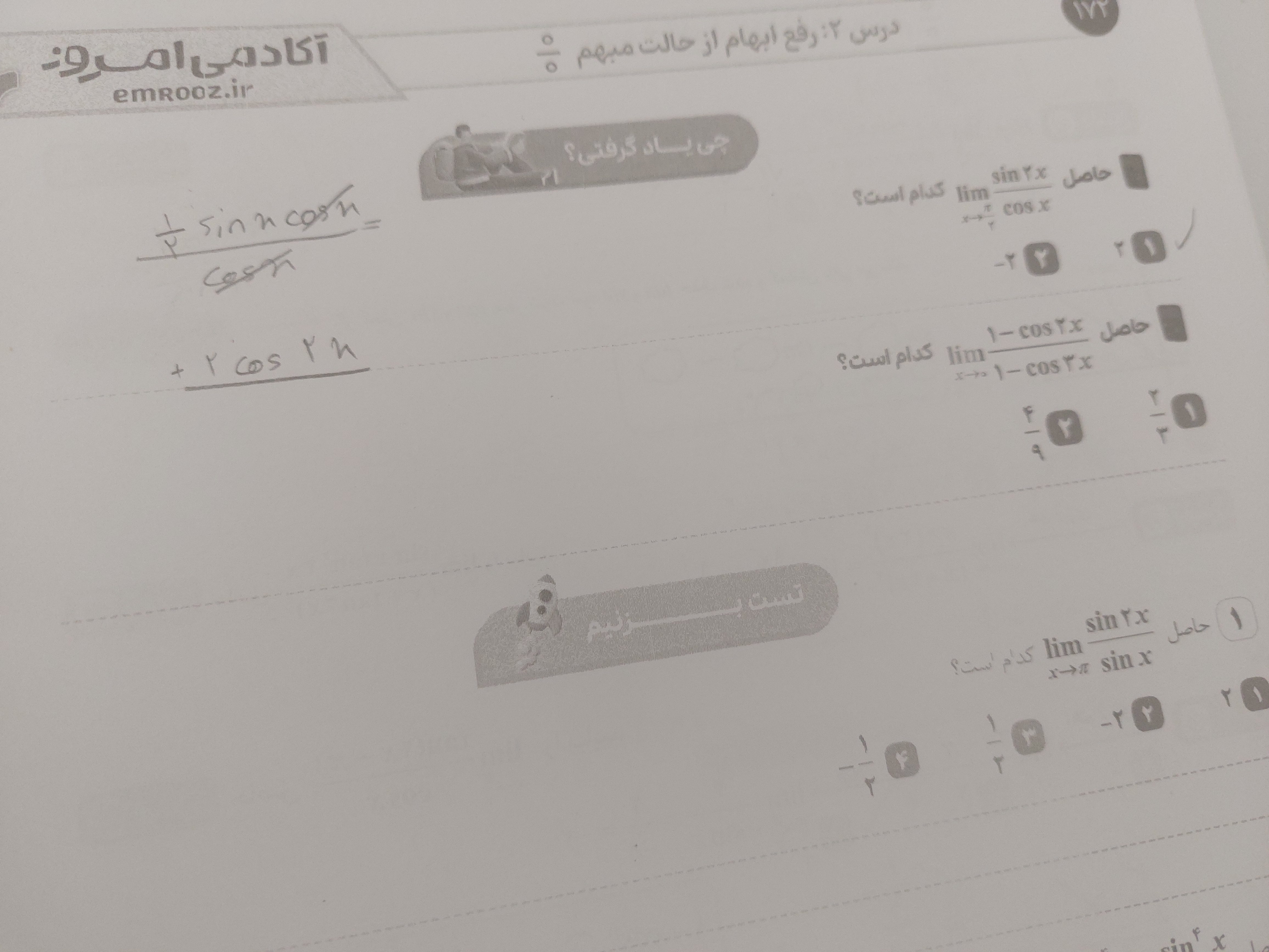 سلام وقت بخیر چرا استاد sin2x/sinرو وقتی با هوپیتال حل میکنن به جای اینکه sin2xرو بزارن 2cos دوباره sin رو هم مینویسن؟