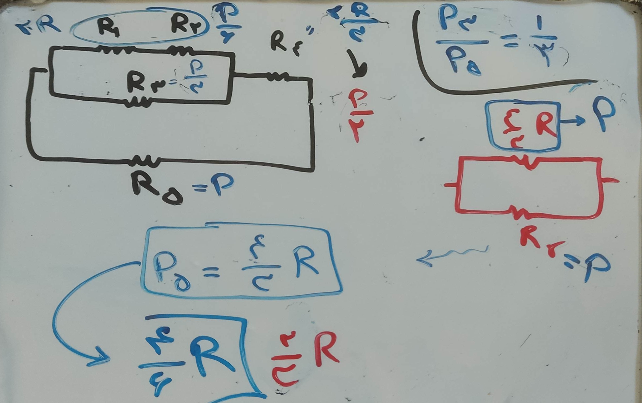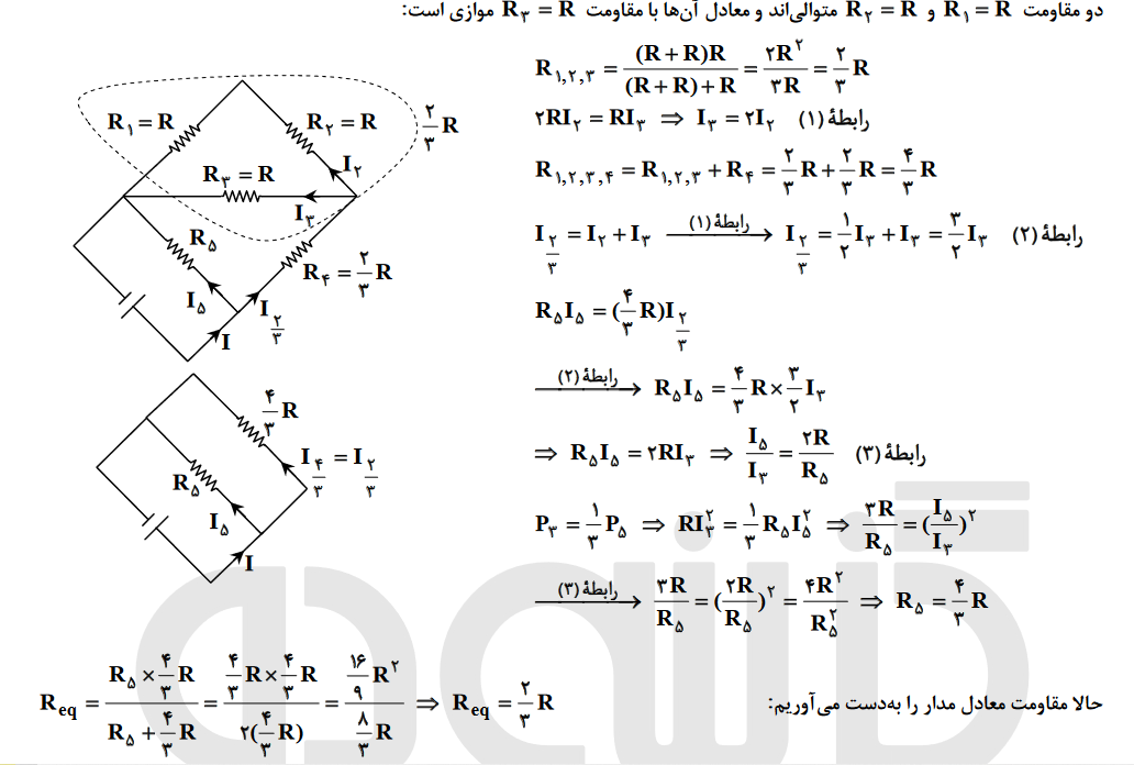 سلام وقتت خوش من راه حلی که ایشون گفتن رو امتحان کردم البته نمیدونم منظورشون دقیقا همین بوده یا نه اما خب در هر صورت جواب داد. ببینید اون قسمت مرتب کردن مقاومت هارو طبق حل استاد پیش برید دقیقا ، متوجه میشید که مقاومت آر5 کاملا با بقیه موازیه و میدونیم که اختلاف پتانسیل مقاومت معادل بقیه مقاومت ها برابر با اختلاف پتانسیل دو سر مقاومت آر5 هستش. معادل بقیه مقاومت ها همونطور که استاد هم بدست اوردن سه چهارم آر هست و جریان عبوری از کل اونها هم 3x میشه. اگر داخل فرمول پتانسیل مقاومت جایگذاری کنیم، جوابی که میده اینه : 4Rx این مقدار همون اختلاف پتانسیل دو سر مقاومت آر5 هم هست پس میایم و طبق اطلاعات سوال، فرمول P=IV رو مینویسیم، نسبت توان های آر5 و آر3 رو که داریم . اختلاف پتانسیل آر5 رو بدست اوردیم و اختلاف پتانسیل آر3 هم میشه 2xR . جریان عبوری از آر3 هم که 2x هست مینویسیم و جریان عبوری از آر5 رو بر حسب x بدست میاریم. که میشه 3x. از اونجا که جریان عبوری از شاخه ای که به بقیه مقاومت ها میره هم همین بود پس نتیجه میگیریم که معادل بقیه مقاومت ها با آر5 دقیقا یکیه. پس آر5 میشه چهارسوم آر . و اگر مقاومت کل مدار رو بگیریم هم میشه دوسوم آر