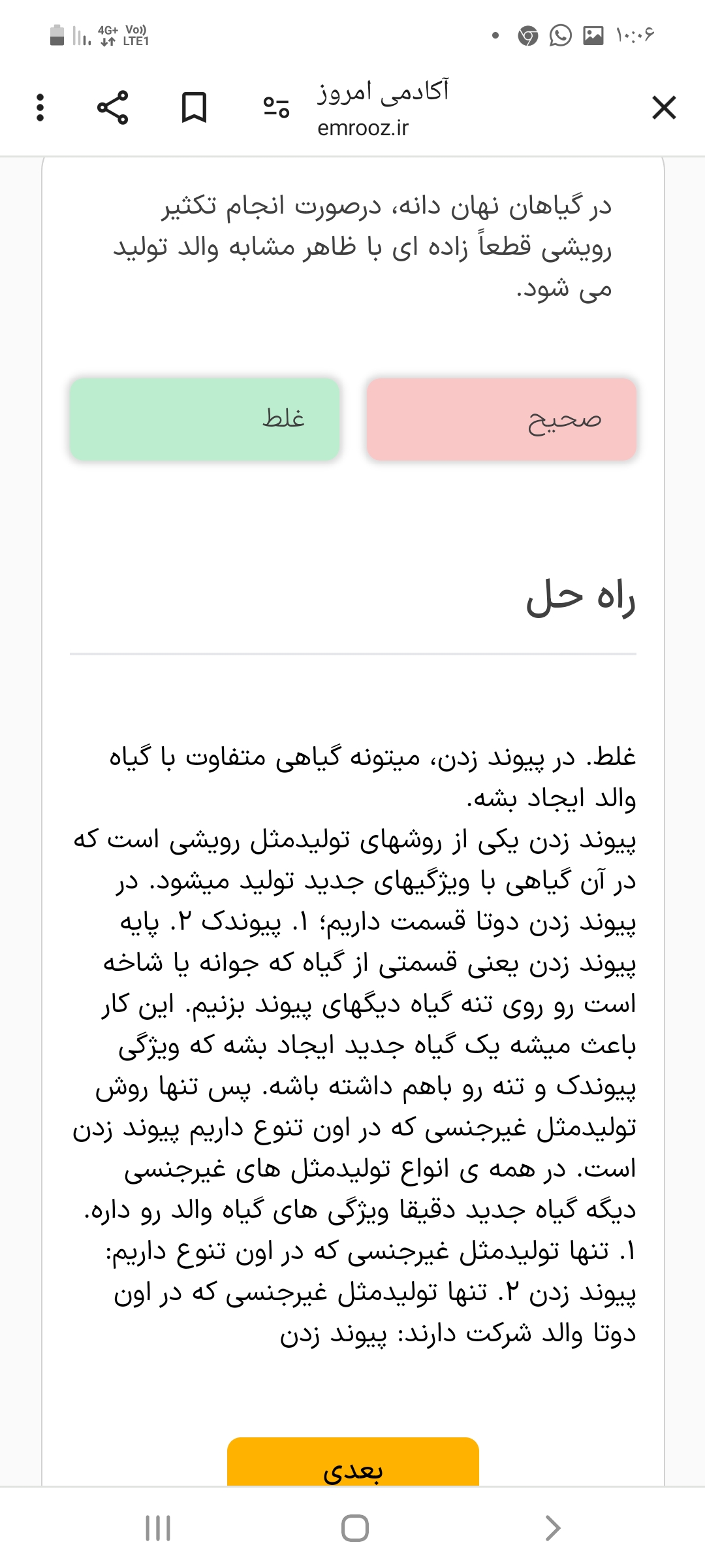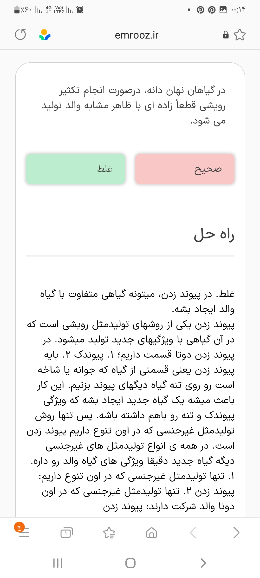 سلام لطفا پاسخ تست ۳ از یادبگیریم ۲ رو تصحیحش کنید خود استاد میگن توی پیوند زنی ۲ تا گیاه داریم نه ۲ والد. ۲ والد برای تولید مثل جنسیه ولی اینجا دقیقا نوشته ۲ والد. یا مثلا اون قسمت که گفته گیاه با ویژگی های جدید ایجاد میشه یکم گنگه اگه میشه بیشتر توضیحش بدین ممنون.