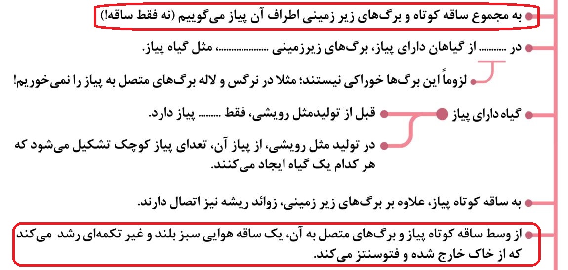 طبق متن صفحه ۳۳۳ جزوه به مجموع ساقه کوتاه و برگ های زیر زمینی اطراف آن پیاز می گوییم و از وسط پیاز یک ساقه هوایی رشد می کند پس جواب گزینه ۳ میشه ؟