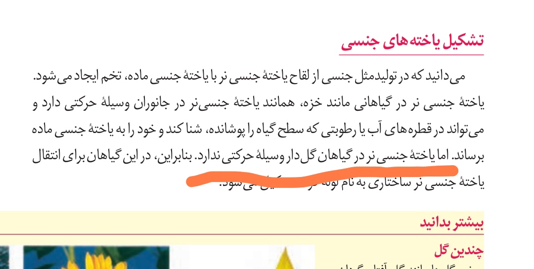 عزیزم تو صفحه ی 125 کتاب، از پایین سطر دوم نوشته که "اما یاخته ی جنسی نر در گیاهان گلدار وسیله حرکتی ندارد"
