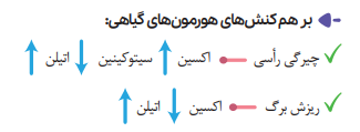 -ریزش برگ در پاسخ به افزایش نسبت اتیلن به اکسین رخ میده یعنی اتیلن زیاد و اکسین کم سیتو کنین در به تأخیر انداختن پیری نقش داره: این هورمون، پیری را در برگها با غلظت نسبتاً کم به تأخیر میاندازد و از ریزش گلها، گلبرگ و میوهها جلوگیری میکند.