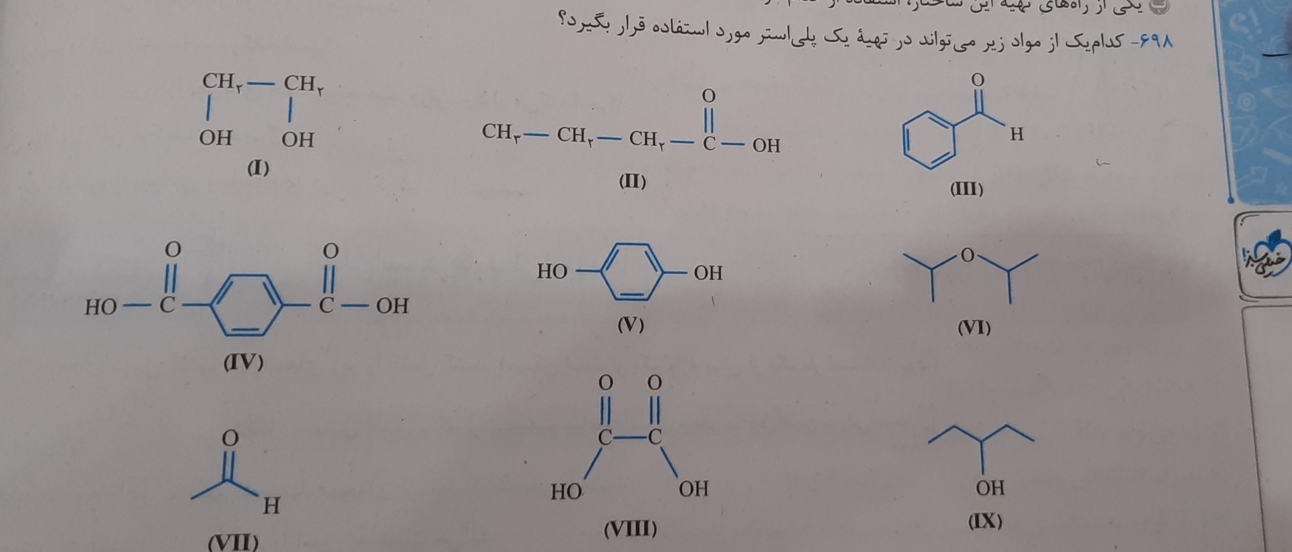 سلام اون هایی که دو عاملی هستند میتونن تو تهیه پلی استر به کار برن. ردیف سمت راست هیچ کدوم. چون هیچ کدومشون دو عاملی نیست. ردیف وسط دو تای پایینی درستن و ردیف چپ دوتای بالایی.