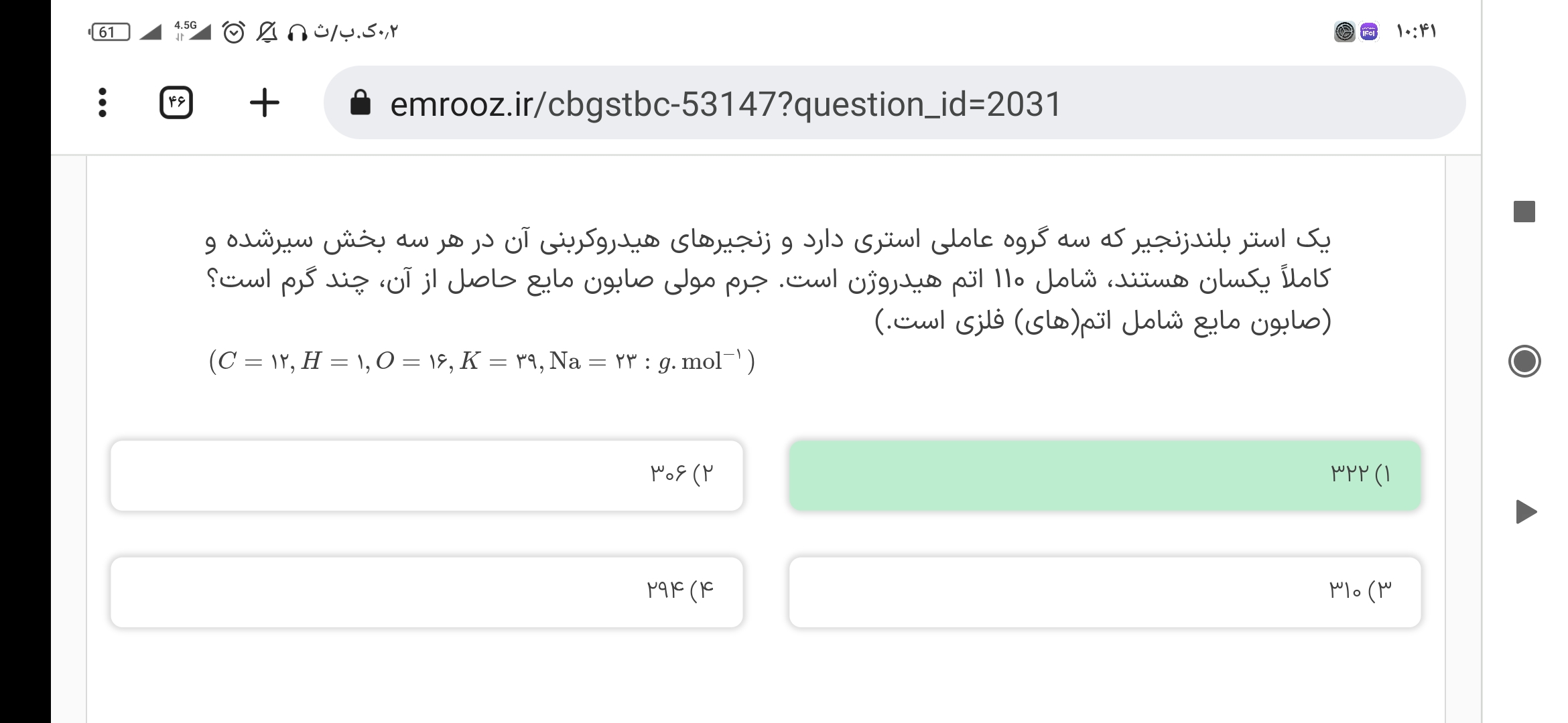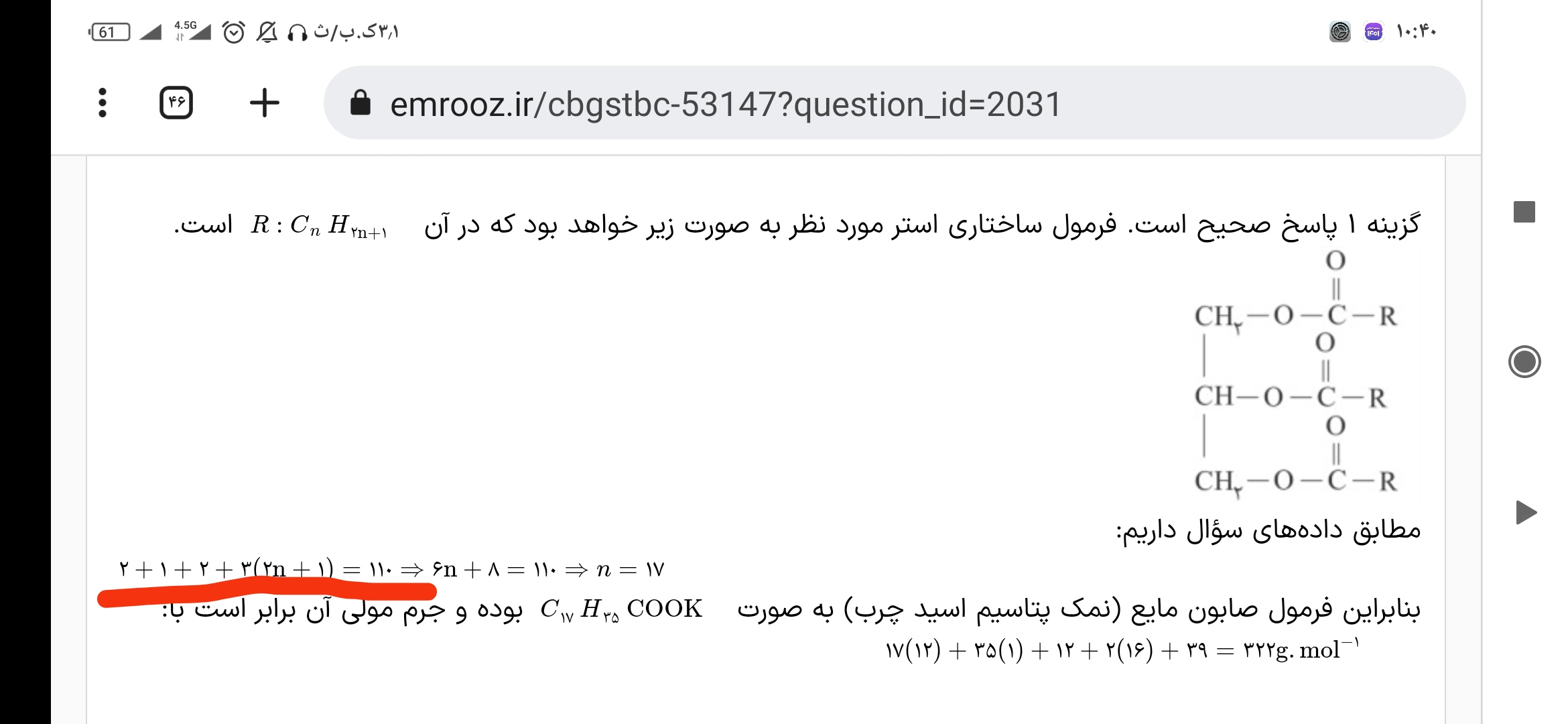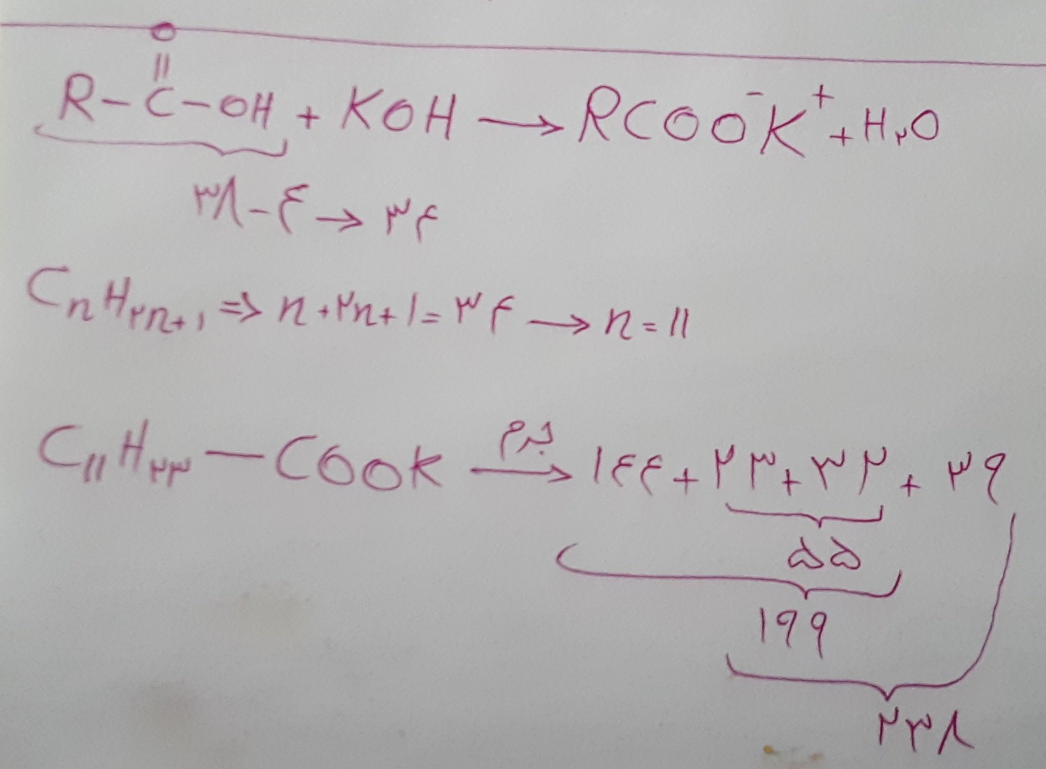سلام توی این سوال نمیتونیم بگیم چون فرمون R زنجیره cnH2n+1 پس ۳n+1 شده ۳۴ از اینجا فرمول صابون رو بدست بیاریم